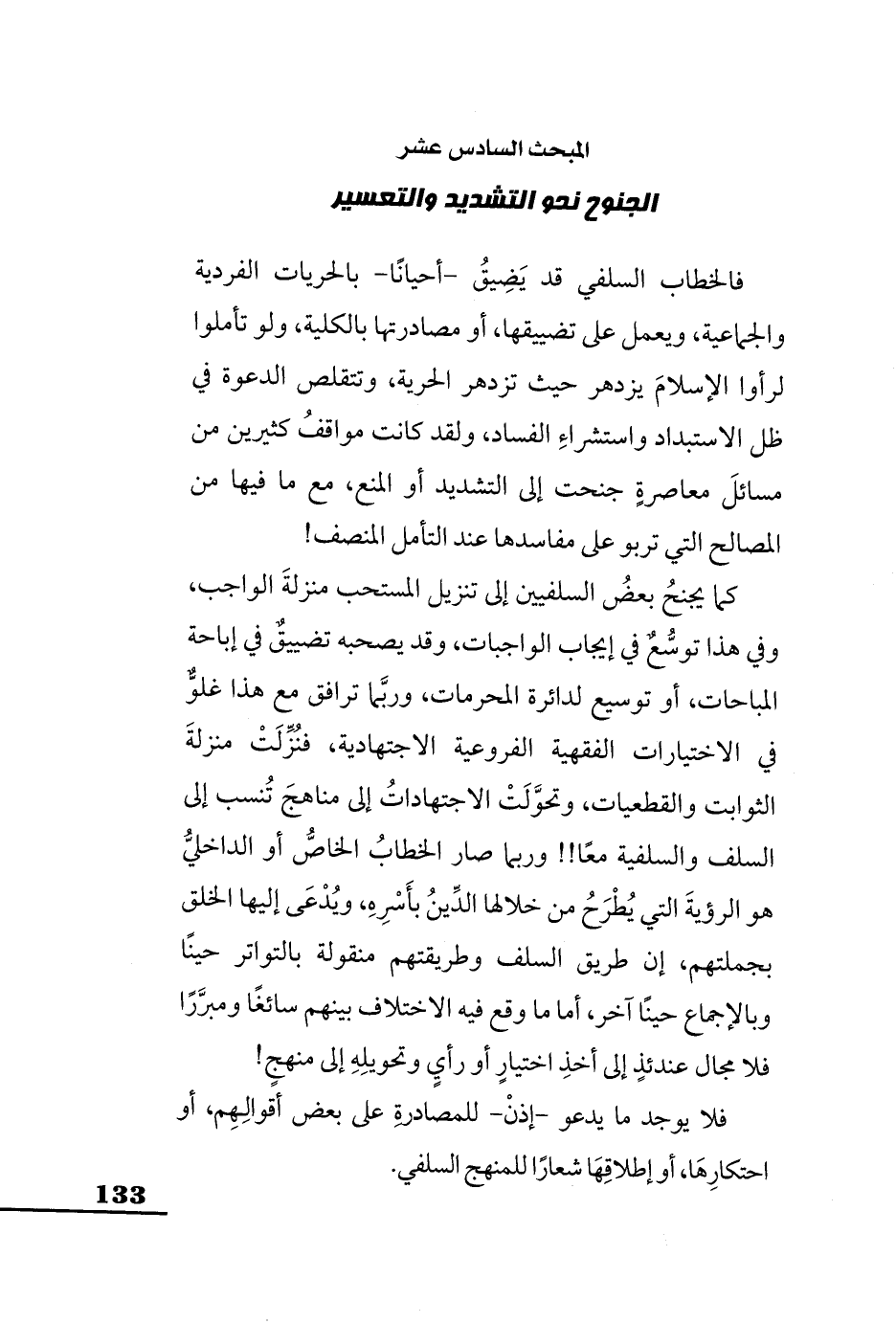 فالخطاب السلفي قد يَضِيقُ -أحيانًا- بالحريات الفردية والجماعية، ويعمل على تضييقها، أو مصادرتها بالكلية، ولو تأملوا لرأوا الإِسلامَ يزدهر حيث تزدهر الحرية، وتتقلص الدعوة في ظل الاستبداد واستشراءِ الفساد، ولقد كانت مواقفُ كثيرين من مسائلَ معاصرةٍ جنحت إلى التشديد أو المنع، مع ما فيها من المصالح التي تربو على مفاسدها عند التأمل المنصف!