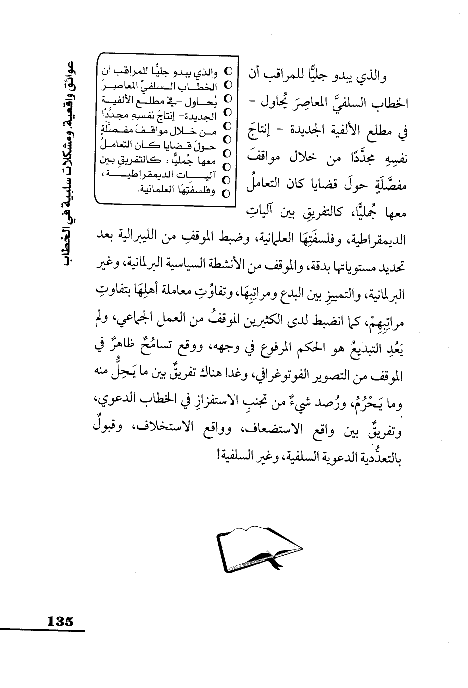 والذي يبدو جليًّا للمراقب أن الخطاب السلفيَّ المعاصِرَ يُحاول -في مطلع الألفية الجديدة- إنتاجَ نفسِهِ مجدَّدًا من خلال مواقفَ مفصَّلَةٍ حولَ قضايا كان التعاملُ معها جُمليًّا، كالتفريقِ بين آلياتِ الديمقراطية، وفلسفَتِهَا العلمانية، وضبط الموقفِ من الليبرالية بعد تحديد مستوياتها بدقة، والموقف من الأنشطة السياسية البرلمانية، وغير البرلمانية، والتمييزِ بين البدع ومراتِبِهَا، وتفاوُتِ معاملة أهلِهَا بتفاوتِ مراتِبِهِمْ، كما انضبط لدى الكثيرين الموقفُ من العمل الجماعي، ولم يَعُدِ التبديعُ هو الحكم المرفوع في وجهه، ووقع تسامُحٌ ظاهرٌ في الموقف من التصوير الفوتوغرافي، وغدا هناك تفريقٌ بين ما يَحِلُّ منه وما يَحْرُمُ، ورُصد شيءٌ من تجنبِ الاستفزازِ في الخطاب الدعوي، وتفريقٌ بين واقع الاستضعاف، وواقع الاستخلاف، وقبولٌ بالتعدُّدية الدعوية السلفية، وغير السلفية!