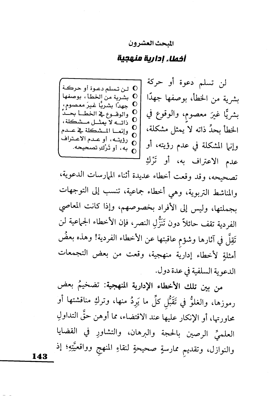 من بين تلك الأخطاء الإدارية المنهجية: تضخيمُ بعض رموزها، والغلوُّ في تَقَبُّلِ كلِّ ما يَرِدُ منها، وتركِ مناقشتها أو محاورتها، أو الإنكار عليها عند الاقتضاء، مما أوهن حقَّ التداولِ العلميِّ الرصين بالحجة والبرهان، والتشاورِ في القضايا والنوازل، وتقديمِ ممارسةٍ صحيحةٍ لنقاءِ المنهجِ وواقعيَّتِهِ؛ إذ