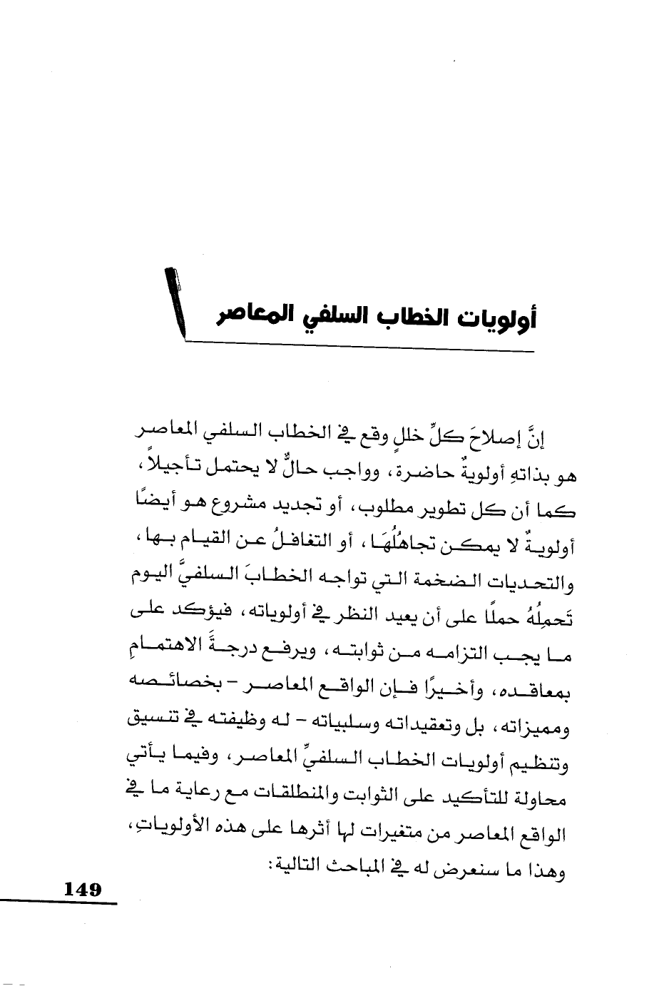 أولويات الخطاب السلفي المعاصر إنَّ إصلاحَ كلِّ خللٍ وقع في الخطاب السلفي المعاصر هو بذاتهِ أولويةٌ حاضرة، وواجب حالٌّ لا يحتمل تأجيلا، كما أن كل تطوير مطلوب، أو تجديد مشروع هو أيضًا أولويةٌ لا يمكن تجاهُلُهَا، أو التغافلُ عن القيام بها، والتحديات الضخمة التي تواجه الخطابَ السلفيَّ اليوم تَحمِلُهُ حملا على أن يعيد النظر في أولوياته، فيؤكد على ما يجب التزامه من ثوابته، ويرفع درجة الاهتمام بمعاقده، وأخيرًا فإن الواقع المعاصر - بخصائصه ومميزاته، بل وتعقيداته وسلبياته - له وظيفته في تنسيق وتنظيم أولويات الخطاب السلفيِّ المعاصر، وفيما يأتي محاولة للتأكيد على الثوابت والمنطلقات مع رعاية ما في الواقع المعاصر من متغيرات لها أثرها على هذه الأولوياتِ، وهذا ما سنعرض له في المباحث التالية: