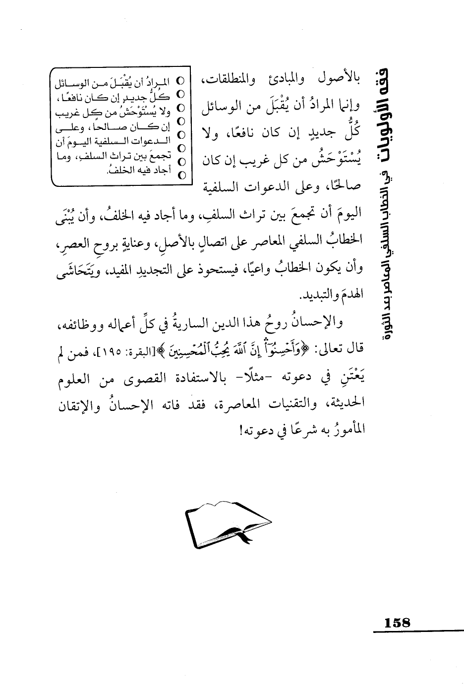 بالأصول والمبادئ والمنطلقات، وإنما المراد أن يُقْبَلَ من الوسائل كل جديدٍ إن كان نافعًا, ولا يسْتَوْحَش من كل غريب إن كان صالحًا، وعلى الدعوات السلفية اليومَ أن تجمعَ بين تراث السلفِ، وما أجاد فيه الخلفُ، وأن يُبْنَى الخطابُ السلفي المعاصر على اتصالٍ بالأصلِ، وعنايةٍ بروحِ العصرِ، وأن يكون الخطابُ واعيًا، فيستحوذ على التجديدِ المفيد، وَيتَحَاشَى الهدمَ والتبديد.