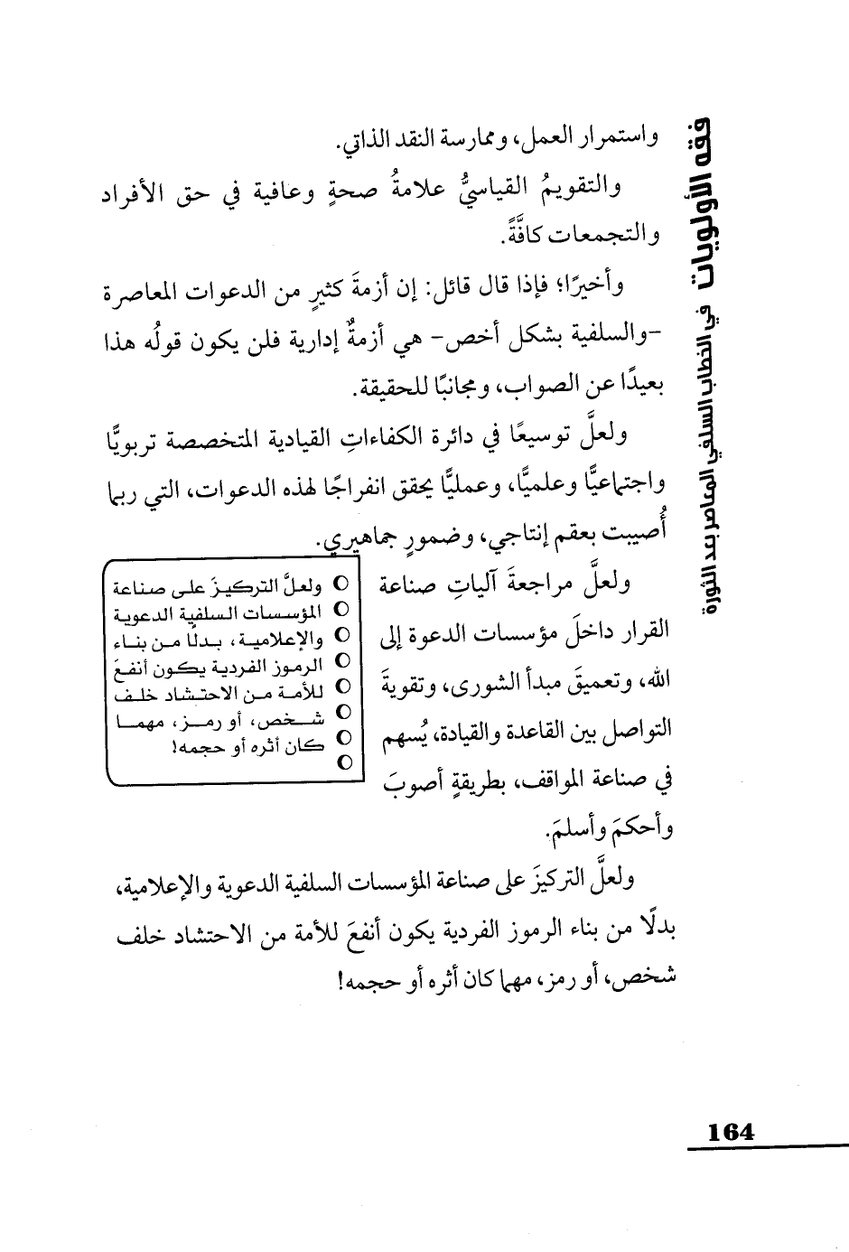 ولعلَّ التركيزَ على صناعة المؤسسات السلفية الدعوية والإعلامية، بدلًا من بناء الرموز الفردية يكون أنفعَ للأمة من الاحتشاد خلف شخص، أو رمز، مهما كان أثره أو حجمه!