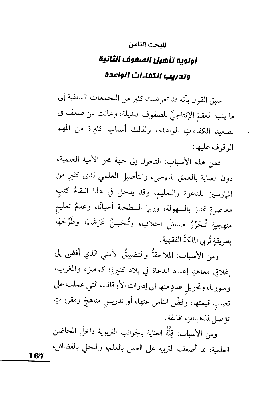 سبق القول بأنه قد تعرضت كثير من التجمعات السلفية إلى ما يشبه العقمَ الإنتاجيَّ للصفوف البديلة، وعانت من ضعف في تصعيد الكفاءاتِ الواعدة، ولذلك أسباب كثيرة من المهم الوقوف عليها: