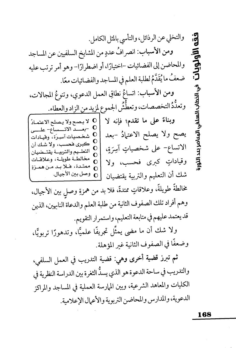 ثم تبرز قضية أخرى وهي: قضية التدريب في العمل السلفي، والتدريب في ساحة الدعوة هو الذي يسدُّ الثغرة بين الدراسة النظرية في الكليات والمعاهد الشرعية، وبين الممارسة العملية في المساجد والمراكز الدعوية، والمدارس والمحاضن التربوية والأعمال الإعلامية.
