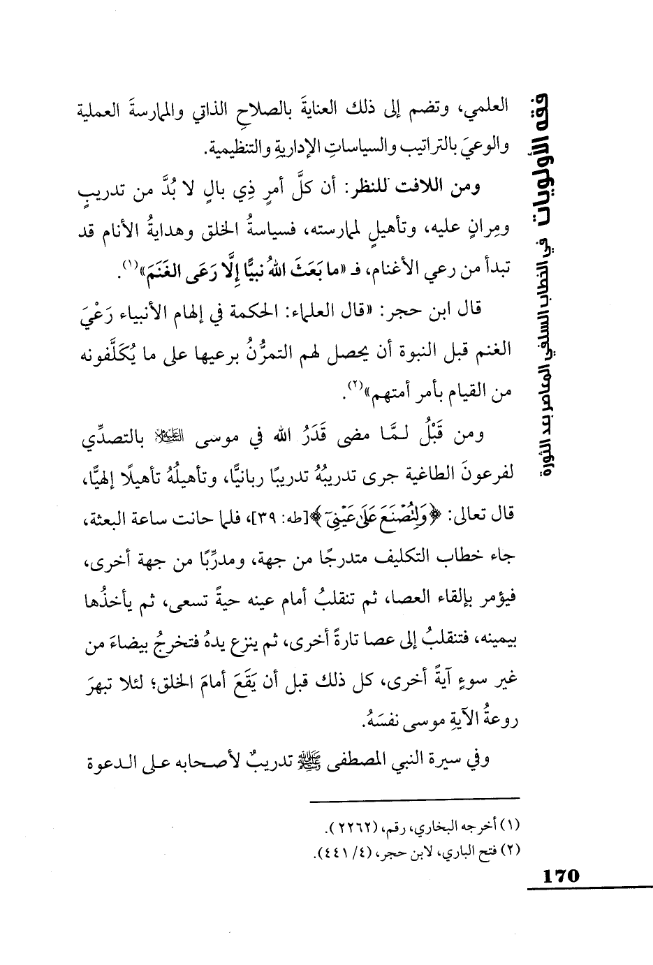 ومن اللافت للنظر: أن كلَّ أمرٍ ذِي بالٍ لا بُدَّ من تدريبٍ ومِرانٍ عليه، وتأهيلٍ لممارسته، فسياسةُ الخلق وهدايةُ الأنام قد تبدأ من رعي الأغنام، فـ "ما بَعَثَ اللهُ نبيًّا إِلَّا رَعَى الغَنَمَ" (¬1).