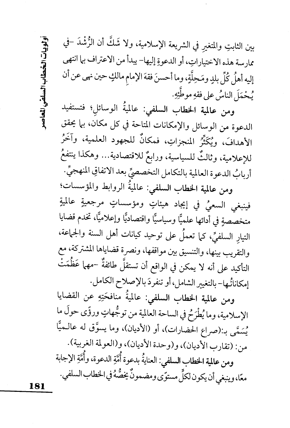 ومن عالمية الخطاب السلفي: العنايةُ بدعوة أُمَّةِ الدعوة، وأُمَّةِ الإجابة معًا، وينبغي أن يكون لكلٍّ مستوًى ومضمونٌ يخصُّهُ في الخطاب السلفي.