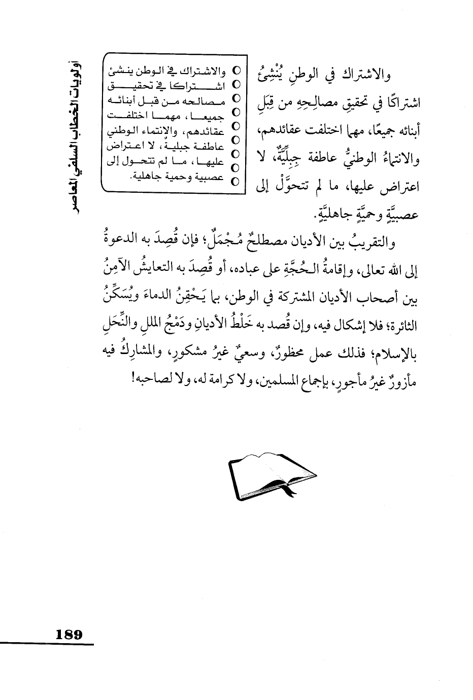 والاشتراك في الوطن يُنْشِئُ اشتراكًا في تحقيقِ مصالِحِهِ من قِبَل أبنائه جميعًا، مهما اختلفت عقائدهم، والانتماءُ الوطنيُّ عاطفة جِبِلِّيَّةٌ، لا اعتراض عليها، ما لم تتحوَّلْ إلى عصبيَّةٍ وحميَّةٍ جاهليَّةٍ.