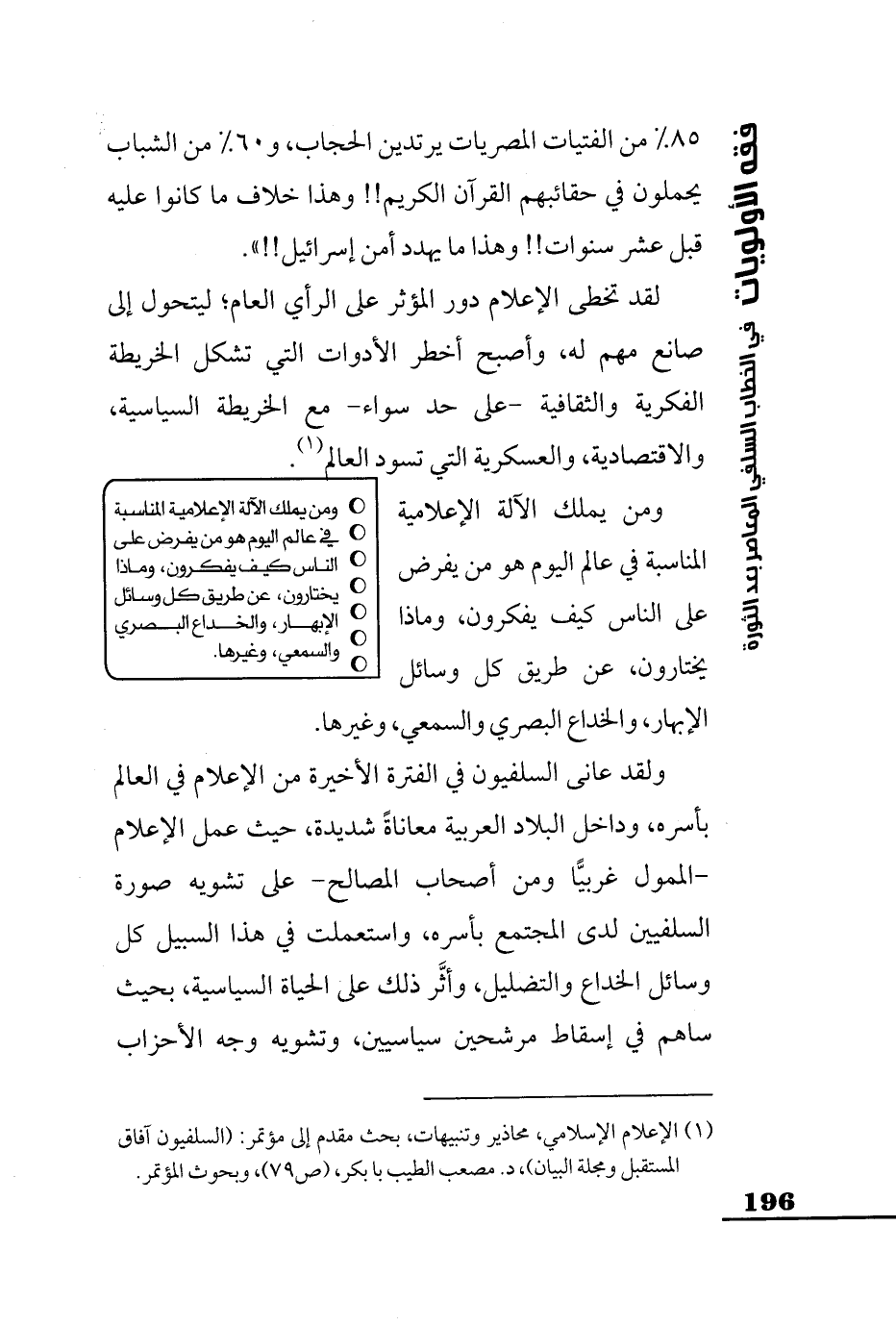 (¬1) الإعلام الإسلامي، محاذير وتنبيهات، بحث مقدم إلى مؤتمر: (السلفيون .. آفاق المستقبل ومجلة البيان)، د. مصعب الطيب با بكر، (ص 79)، وبحوث المؤتمر.