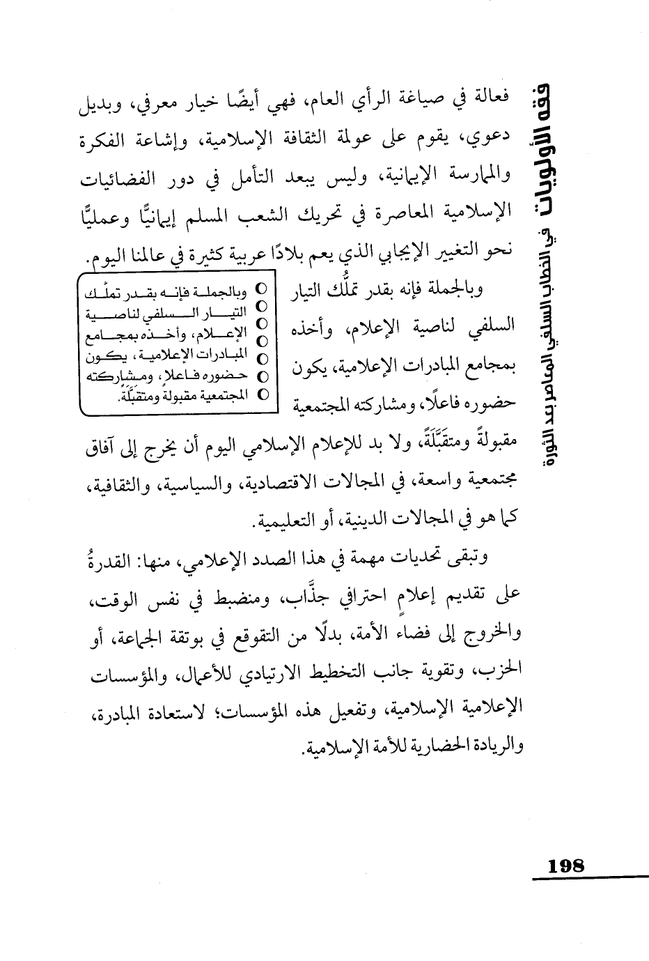 وبالجملة فإنه بقدر تملُّك التيار السلفي لناصية الإعلام، وأخذه: الإعلام، وأخذه بمجامع المبادرات الإعلامية، يكون حضوره فاعلًا، ومشاركته المجتمعية مقبولةً ومتقَبَّلَةً، ولا بد للإعلام الإسلامي اليوم أن يخرج إلى آفاق مجتمعية واسعة، في المجالات الاقتصادية، والسياسية، والثقافية، كما هو في المجالات الدينية، أو التعليمية.