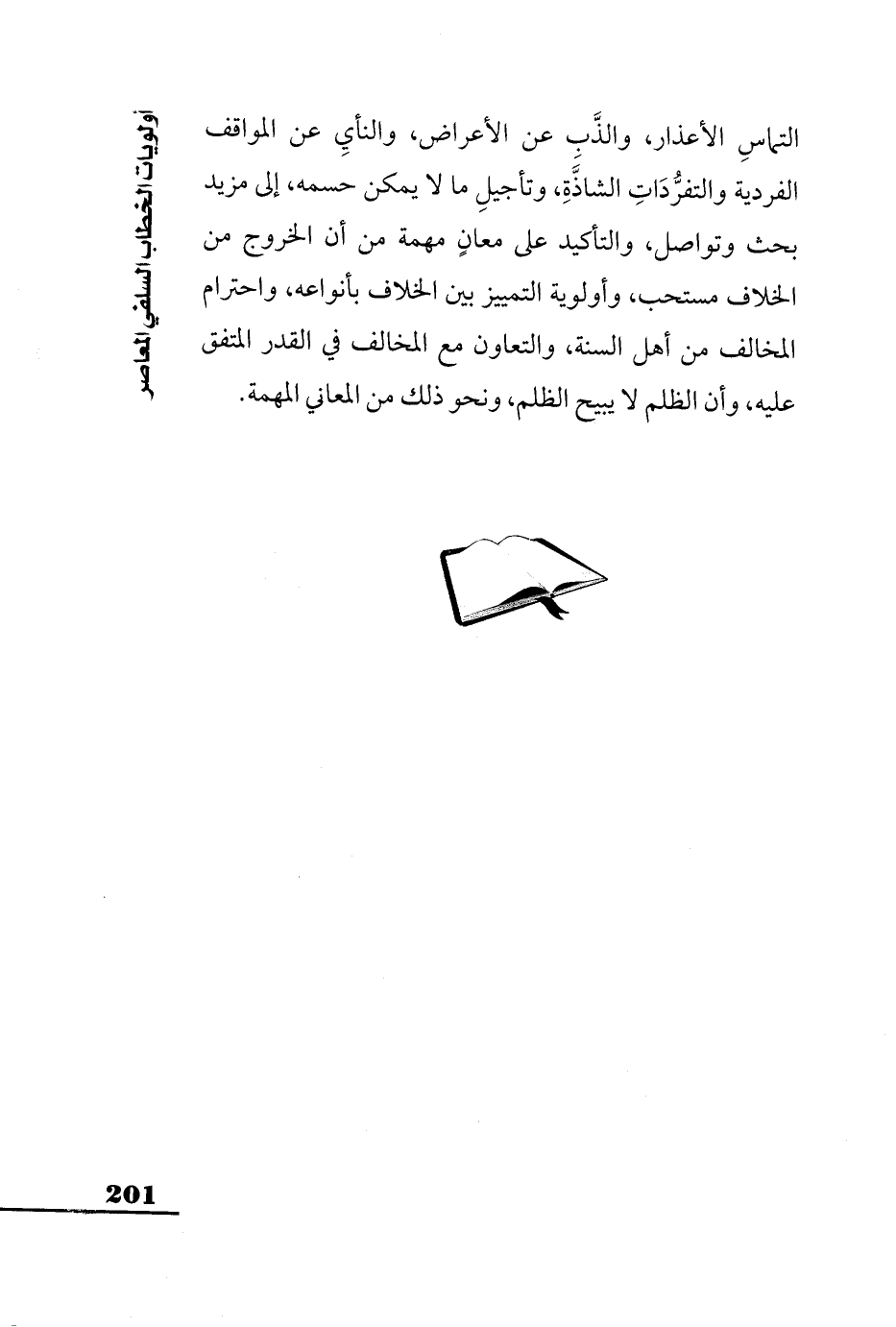 التماسِ الأعذار، والذَّبِ عن الأعراض، والنأيِ عن المواقف الفردية والتفرُّدَاتِ الشاذَّةِ، وتأجيلِ ما لا يمكن حسمه، إلى مزيد بحث وتواصل، والتأكيد على معانٍ مهمة من أن الخروج من الخلاف مستحب، وأولوية التمييز بين الخلاف بأنواعه، واحترام المخالف من أهل السنة، والتعاون مع المخالف في القدر المتفق عليه، وأن الظلم لا يبيح الظلم، ونحو ذلك من المعاني المهمة.
