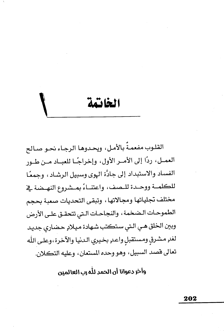 القلوب مفعمةٌ بالأمل، ويحدوها الرجاء نحو صالح العمل، ردا إلى الأمر الأول، وإخراجًا للعباد من طور الفساد والاستبداد إلى جادَّة الهدى وسبيل الرشاد، وجمعًا للكمة ووحدة للصف، واعتناءً بمشروع النهضة في مختلف تجلياتها ومجالاتها، وتبقى التحديات صعبة بحجم الطموحات الضخمة، والنجاحات التي تتحقق على الأرض وبين الخلق هي التي ستكتب شهادة ميلادٍ حضاري جديد لغدٍ مشرقٍ ومستقبلٍ واعدٍ بخيري الدنيا والآخرة، وعلى الله تعالى قصد السبيل، وهو وحده المستعان، وعليه التكلان.
