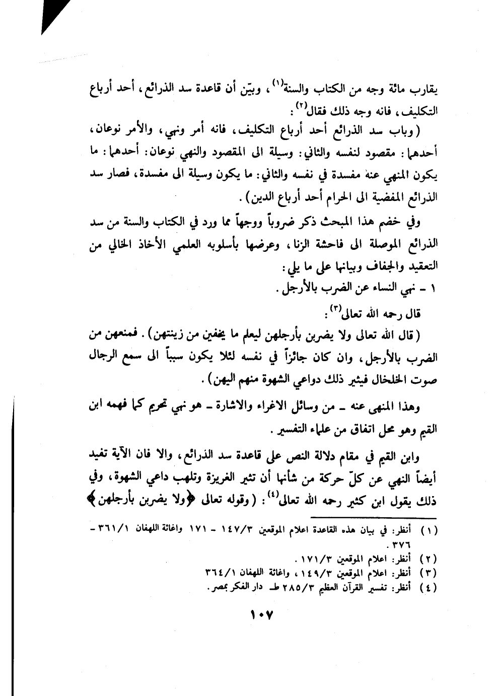 وابن القيم في مقام دلالة النص على قاعدة سد الذرائع، وإلا فإن الآية تفيد أيضاً النهي عن كلّ حركة من شأنها أن تثير الغريزة وتلهب داعي الشهوة، وفي ذلك يقول ابن كثير رحمه الله تعالى (8) : (وقوله تعالى (ولا يضربن بأرجلهن)