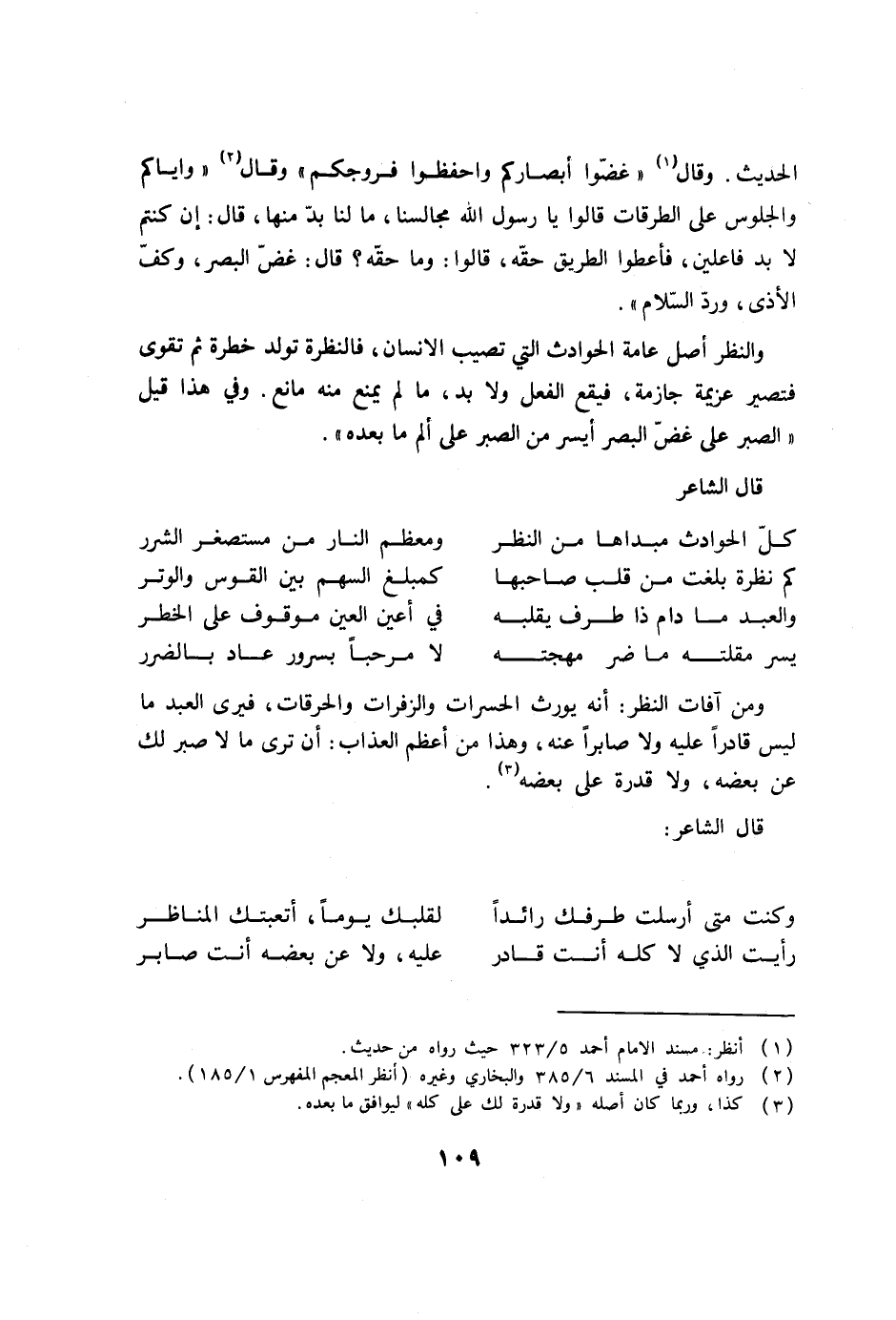 الحديث. وقال (1) " غضّوا أبصاركم واحفظوا فروجكم " وقال (2) (وإياكم والجلوس على الطرقات قالوا يا رسول الله مجالسنا، ما لنا بدّ منها، قال: إن كنتم لا بد فاعلين، فأعطوا الطريق حقّه، قالوا: وما حقّه؟ قال: غض البصر، وكفّ الأذى، ورد السّلام".