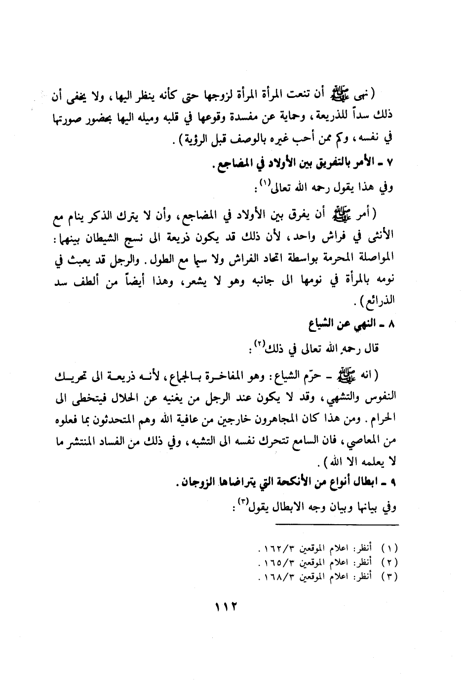 (أنه صلى الله عليه وسلم حرّم الشياع: وهو المفاخرة بالجماع، لأنه ذريعة إلى تحريك النفوس والتشهي، وقد لا يكون عند الرجل من يغنيه عن الحلال فيتخطى إلى الحرام. ومن هذا كان المجاهرون خارجين من عافية الله وهم المتحدثون بما فعلوه من المعاصي، فإن السامع تتحرك نفسه إلى التشبه، وفي ذلك من الفساد المنتشر ما