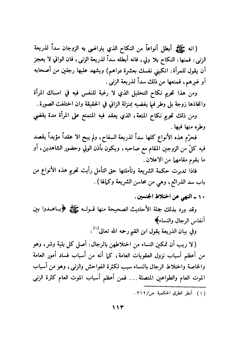 (أنه صلى الله عليه وسلم أبطل أنواعاً من النكاح الذي يتراضى به الزوجان سداً لذريعة الزنى: فمنها: النكاح بلا ولي، فانه أبطله سداً لذريعة الزنى، فإن الزاني لا يعجز أن يقول للمرأة: انكيني أنكحيني نفسك بعشرة دراهم) ويشهد عليها رجلين من أصحابه أو غيرهم، فمنعها من ذلك سداً لذريعة الزنى.