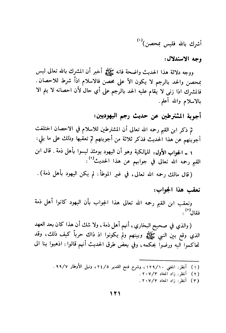 ثم ذكر ابن القيم رحمه الله تعالى أن المشترطين للإسلام في الإحصان اختلفت أجوبتهم عن هذا الحديث فذكر ثلاثة من أجوبتهم ثم تعقبها وذلك على ما يلي:
