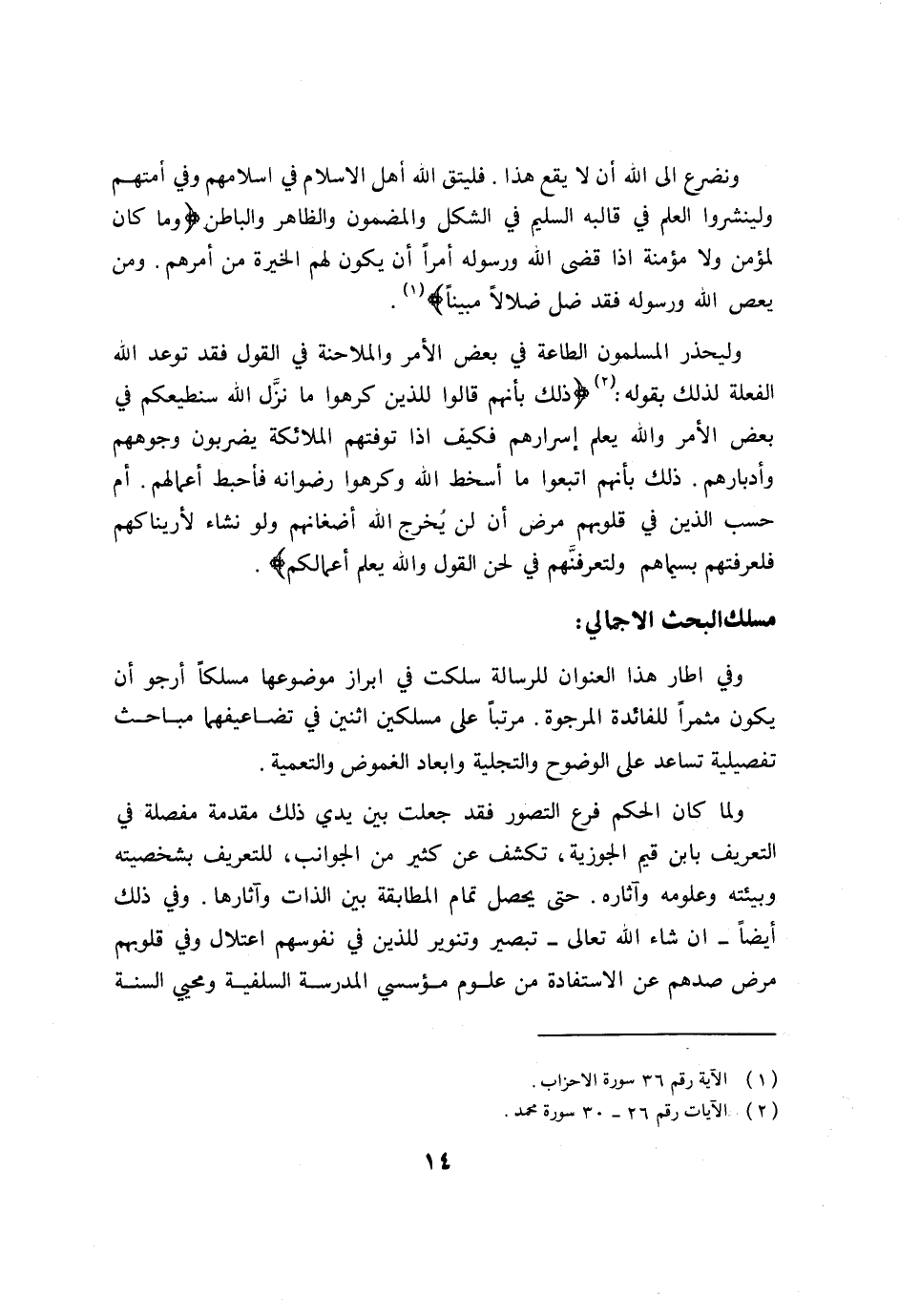 ولما كان الحكم فرع التصور فقد جعلت بين يدي ذلك مقدمة مفصلة في التعريف بابن قيم الجوزية، تكشف عن كثير من الجوانب، للتعريف بشخصيته وبيئته وعلومه وآثاره. حتى يحصل تمام المطابقة بين الذات وآثارها. وفي ذلك أيضاً- أن شاء الله تعالى- تبصير وتنوير للذين في نفوسهم اعتلال وفي قلوبهم مرض صدهم عن الاستفادة من علوم مؤسسي المدرسة السلفية ومحيي السنة