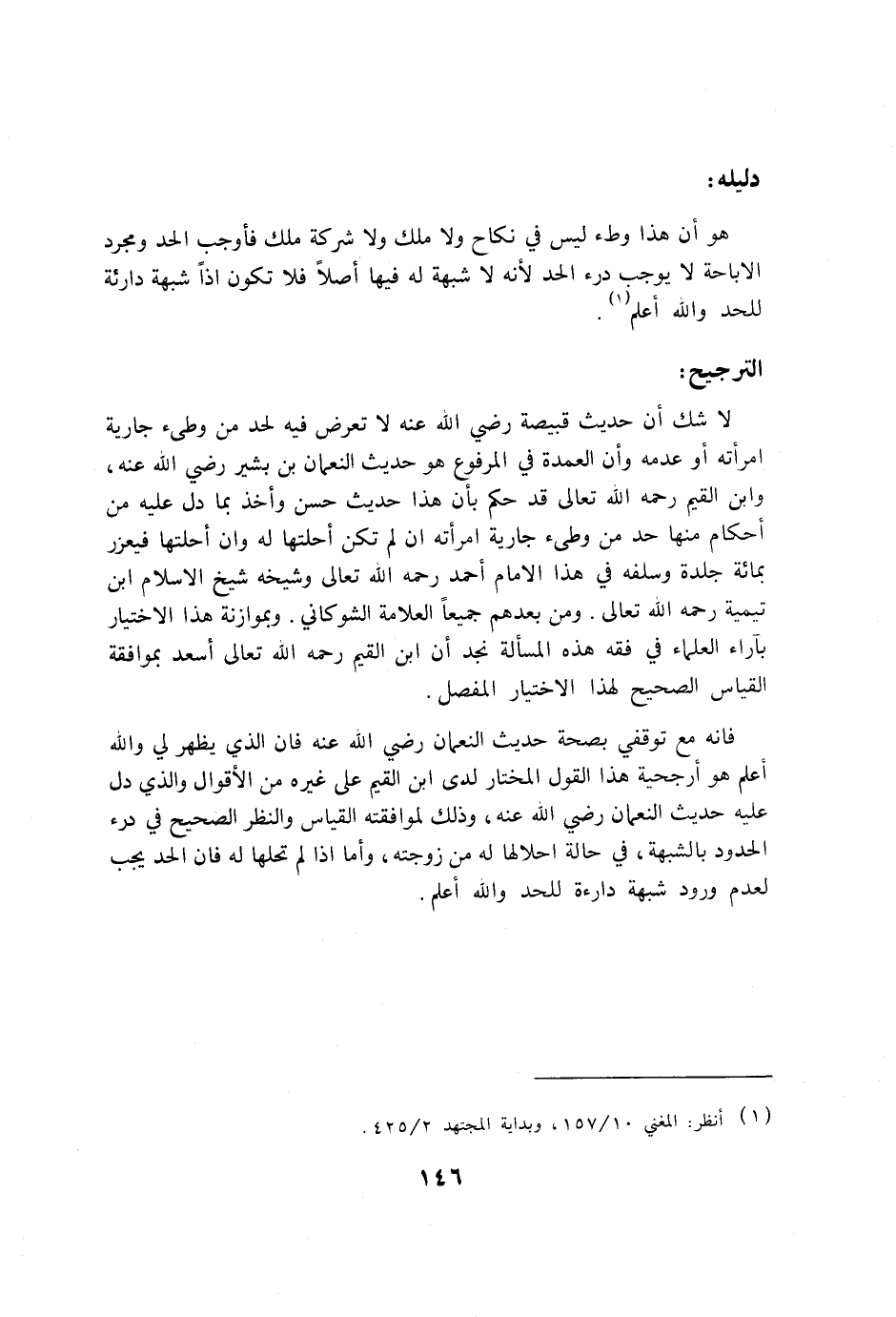 فانه مع توقفي بصحة حديث النعمان رضي الله عنه فإن الذي يظهر لي والله أعلم هو أرجحية هذا القول المختار لدى ابن القيم على غيره من الأقوال والذي دل عليه حديث النعمان رضي الله عنه، وذلك لموافقته القياس والنظر الصحيح في درء الحدود بالشبهة، في حالة إحلالها له من زوجته، وأما إذا لم تحلها له فإن الحد يجب لعدم ورود شبهة دارءة للحد والله أعلم.