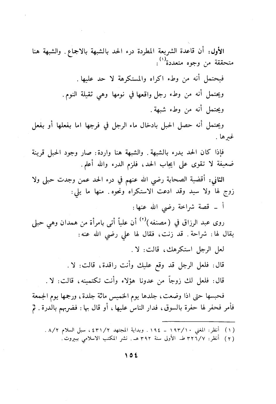 روى عبد الرزاق في (مصنفه) (2) أن علياً أتى بامرأة من همدان وهي حبلى يقال لها: شراحة. قد زنت، فقال لها علي رضي الله عنه: