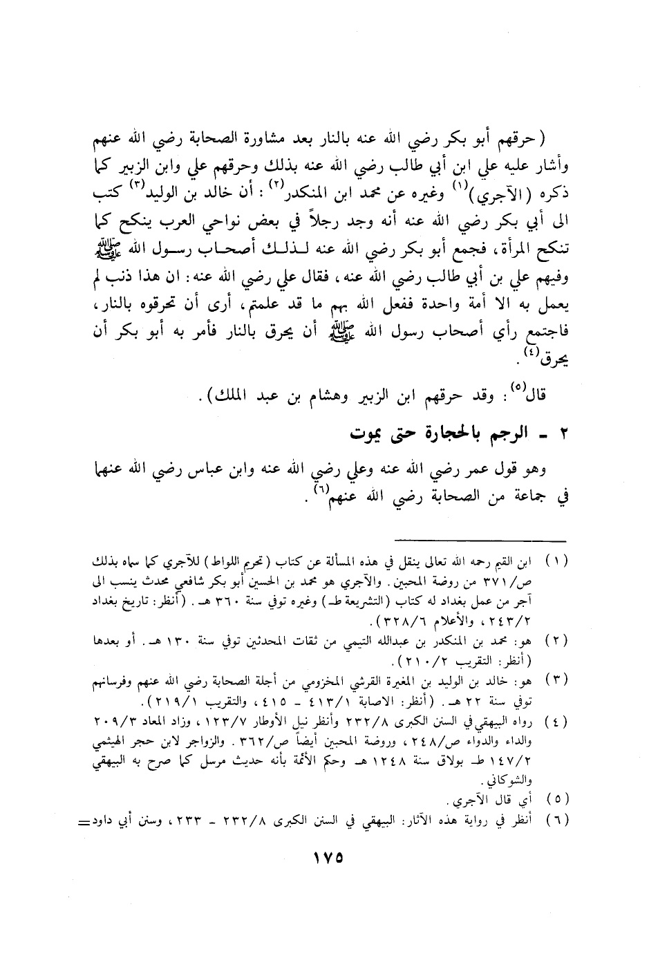 (حرقهم أبو بكر رضي الله عنه بالنار بعد مشاورة الصحابة رضي الله عنهم وأشار عليه علي ابن أبي طالب رضي الله عنه بذلك وحرقهم علي وابن الزبير كما ذكره (الآجري) (1) وغيره عن محمد ابن المنكدر (2) : أن خالد بن الوليد (3) كتب إلى أبي بكر رضي الله عنه أنه وجد رجلاً في بعض نواحي العرب ينكح كما تنكح المرأة، فجمع أبو بكر رضي الله عنه لذلك أصحاب رسول الله صلى الله عليه وسلم وفيهم علي بن أبي طالب رضي الله عنه، فقال علي رضي الله عنه: أن هذا ذنب لم يعمل به إلا أمة واحدة ففعل الله بهم ما قد علمتم، أرى أن تحرقوه بالنار، فاجتمع رأي أصحاب رسول الله صلى الله عليه وسلم أن يحرق بالنار فأمر به أبو بكر أن يحرق (4) .
