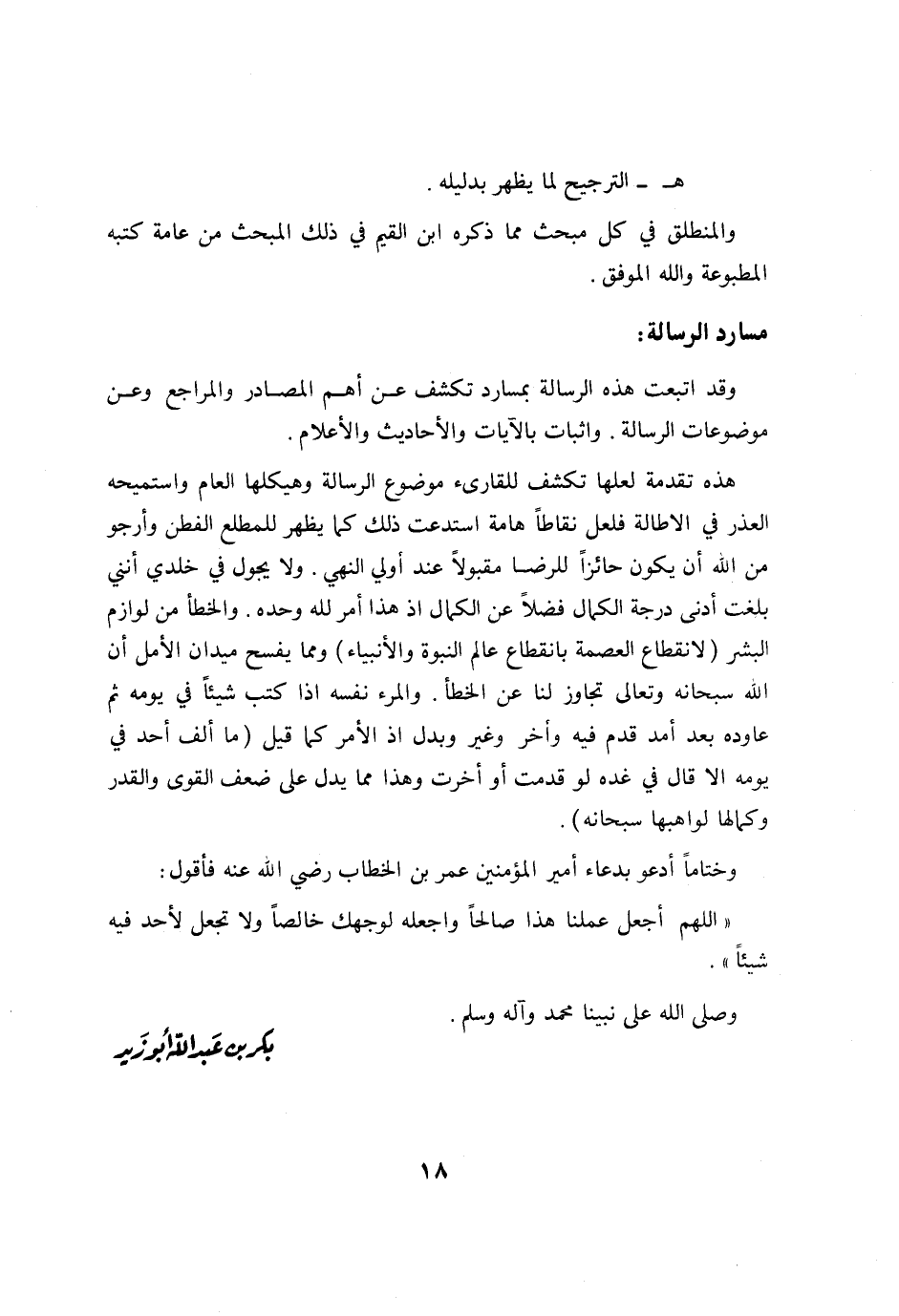 هذه تقدمة لعلها تكشف للقارئ موضوع الرسالة وهيكلها العام واستميحه العذر في الإطالة فلعل نقاطاً هامة استدعت ذلك كما يظهر للمطلع الفطن وأرجو من الله أن يكون حائزاً للرضا مقبولاً عند أولي النهي. ولا يجول في خلدي أنني بلغت أدنى درجة الكمال فضلاً عن الكمال إذ هذا أمر لله وحده. والخطأ من لوازم البشر (لانقطاع العصمة بانقطاع عالم النبوة والأنبياء) ومما يفسح ميدان الأمل أن الله سبحانه وتعالى تجاوز لنا عن الخطأ. والمرء نفسه إذا كتب شيئاً في يومه ثم عاوده بعد أمد قدم فيه وأخر وغير وبدل إذ الأمر كما قيل (ما ألف أحد في يومه إلا قال في غده لو قدمت أو أخرت وهذا مما يدل على ضعف القوى والقدر وكمالها لواهبها سبحانه) .