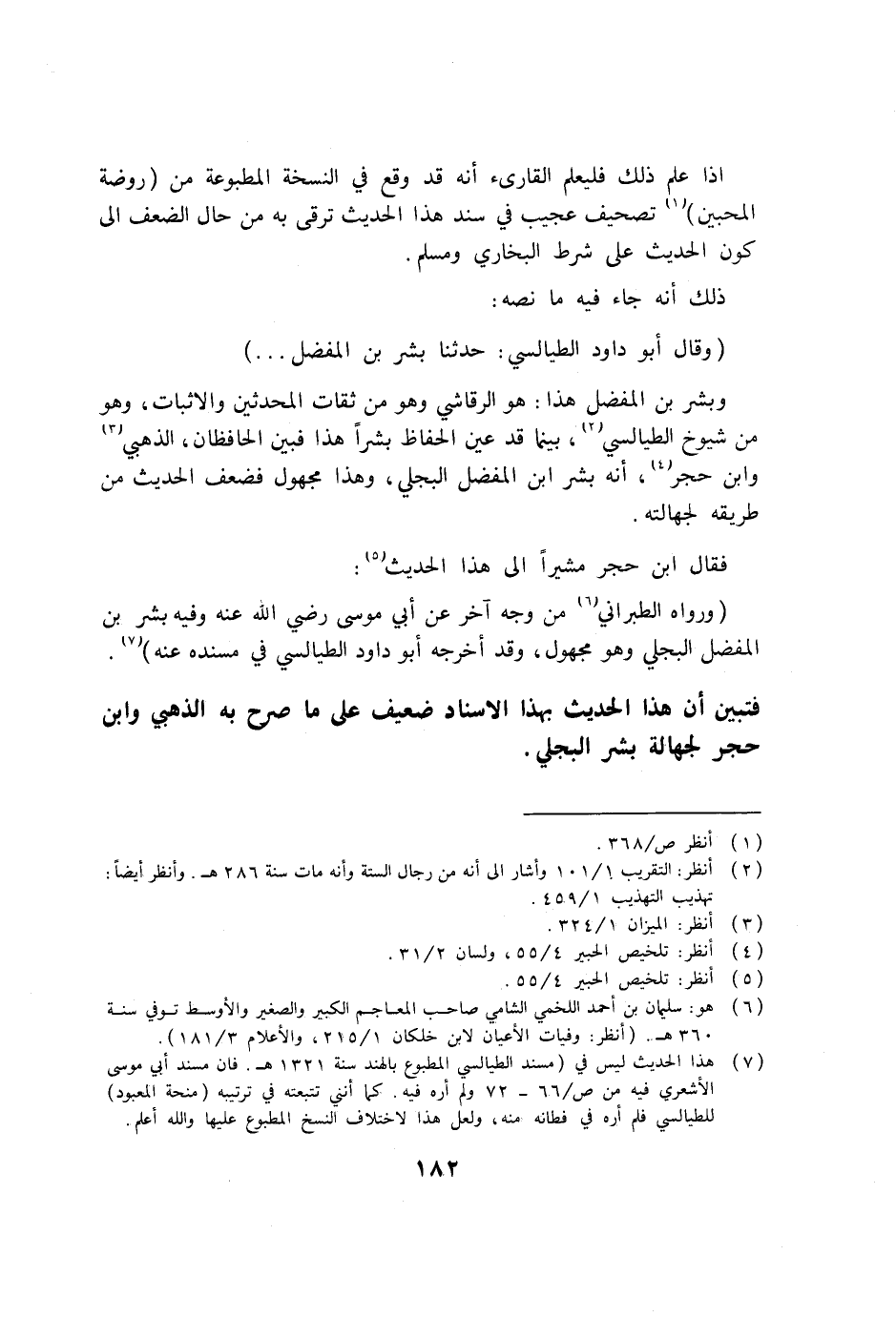 (ورواه الطبراني (6) من وجه آخر عن أبي موسى رضي الله عنه وفيه بشر بن المفضل البجلي وهو مجهول، وقد أخرجه أبو داود الطيالسي في مسنده عنه) (7) . فتبين أن هذا الحديث بهذا الإسناد ضعيف على ما صرح به الذهبي وابن حجر لجهالة بشر البجلي.