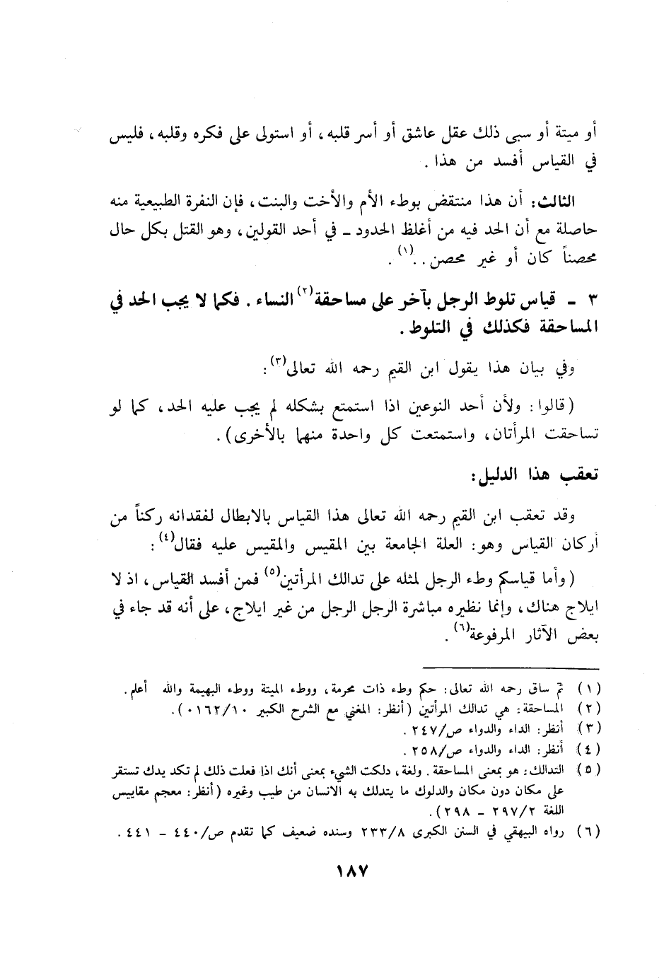 3- قياس تلوط الرجل بآخر على مساحقة (2) النساء. فكلما لا يجب الحد في المساحقة فكذلك في التلوط.