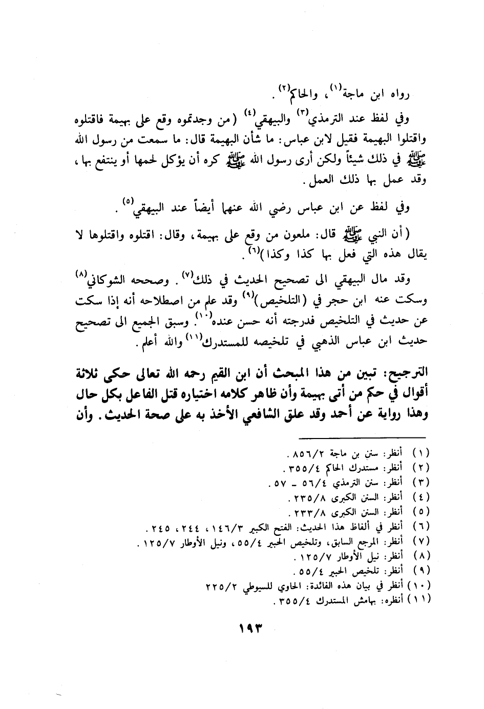 وفي لفظ عند الترمذي (3) والبيهقي (4) (من وجدتموه وقع على بهيمة فاقتلوه واقتلوا البهيمة فقيل لابن عباس: ما شأن البهيمة قال: ما سمعت من رسول الله في ذلك شيئاً ولكن أرى رسول الله صلى الله عليه وسلم كره أن يؤكل لحمها أو ينتفع بها، وقد عمل بها ذلك العمل.