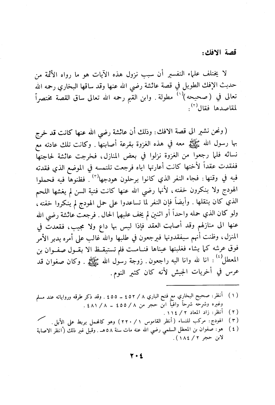 بها رسول الله صلى الله عليه وسلم معه في هذه الغزوة بقرعة أصابتها. وكانت تلك عادته مع نسائه فلما رجعوا من الغزوة نزلوا في بعض المنازل، فخرجت عائشة لحاجتها ففقدت عقداً لأختها كانت أعارتها إياه فرجعت تلتمسه في الموضع الذي فقدته فيه في وقتها: فجاء النفر الذي كانوا يرحلون هودجها (3) . فظنوها فيه فحملوا الهودج ولا ينكرون خفته، لأنها رضي الله عنها كانت فتية السن لم يغشها اللحم الذي كان يثقلها. وأيضا فإن النفر لما تساعدوا على حمل الهودج لم ينكروا خفته، ولو كان الذي حمله واحداً أو اثنين لم يخف عليهما الحال. فرجعت عائشة رضي الله عنها إلى منازلهم وقد أصابت العقد فإذا ليس بها داع ولا مجيب، فقعدت في المنزل، وظنت أنهم سيفقدونها فيرجعون في طلبها والله غالب على أمره يدبر الأمر فوق عرشه كما يشاء فغلبتها عيناها فنامت فلم تستيقظ إلا بقول صفوان بن المعطل (4) : إنا لله وإنا إليه راجعون. زوجة رسول الله صلى الله عليه وسلم. وكان صفوان قد عرس في أخريات الجيش لأنه كان كثير النوم.