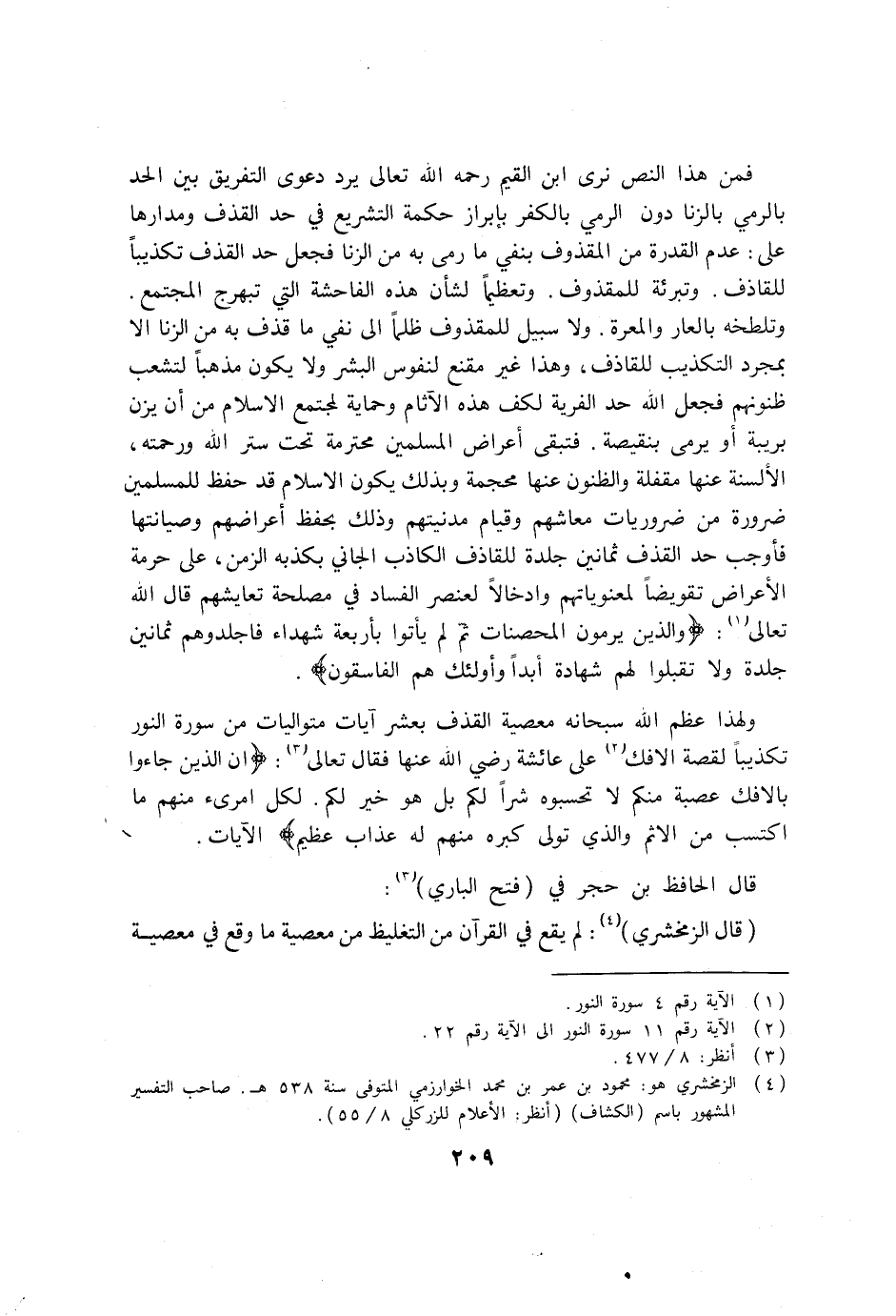 فمن هذا النص نرى ابن القيم رحمه الله تعالى يرد دعوى التفريق بين الحد بالرمي بالزنا دون الرمي بالكفر بإبراز حكمة التشريع في حد القذف ومدارها على: عدم القدرة من المقذوف بنفي ما رمى به من الزنا فجعل حد القذف تكذيباً للقاذف. وتبرئة للمقذوف. وتعظيما لشأن هذه الفاحشة التي تبهرج المجتمع. وتلطخه بالعار والمعرة. ولا سبيل للمقذوف ظلماً إلى نفي ما قذف به من الزنا إلا بمجرد التكذيب للقاذف، وهذا غير مقنع لنفوس البشر ولا يكون مذهباً لتشعب ظنونهم فجعل الله حد الفرية لكف هذه الآثام وحماية لمجتمع الإسلام من أن يزن بريبة أو يرمى بنقيصة. فتبقى أعراض المسلمين محترمة تحت ستر الله ورحمته، الألسنة عنها مقفلة والظنون عنها محجمة وبذلك يكون الإسلام قد حفظ للمسلمين ضرورة من ضروريات معاشهم وقيام مدنيتهم وذلك بحفظ أعراضهم وصيانتها فأوجب حد القذف ثمانين جلدة للقاذف الكاذب الجاني بكذبه الزمن، على حرمة الأعراض تقويضاً لمعنوياتهم وإدخالاً لعنصر الفساد في مصلحة تعايشهم قال الله تعالى (1) : (والذين يرمون المحصنات ثم لم يأتوا بأربعة شهداء فاجلدوهم ثمانين جلدة ولا تقبلوا لهم شهادة أبداً وأولئك هم الفاسقون) .