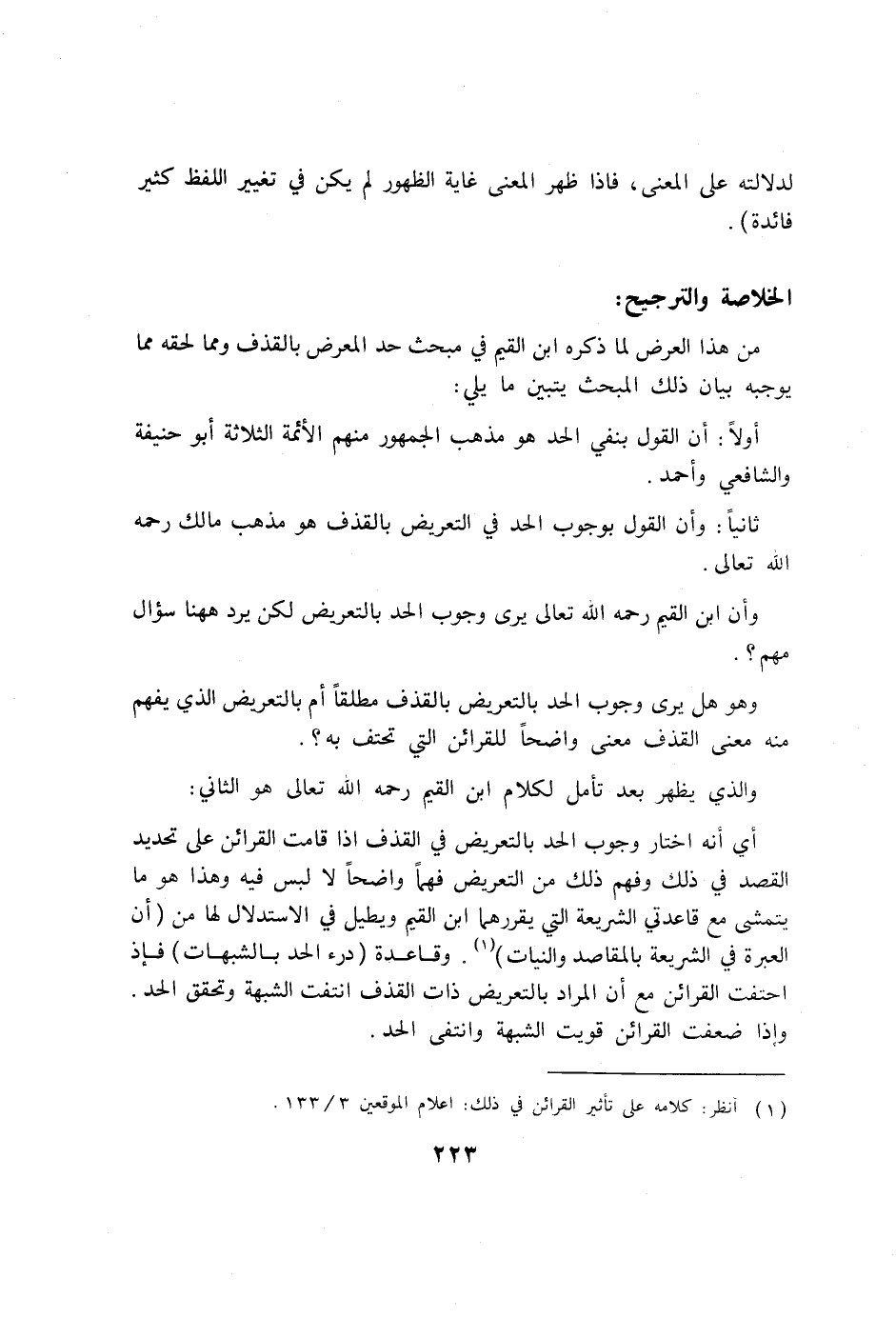 أي أنه اختار وجوب الحد بالتعريض في القذف إذا قامت القرائن على تحديد القصد في ذلك وفهم ذلك من التعريض فهماً واضحاً لا لبس فيه وهذا هو ما يتمشى مع قاعدتي الشريعة التي يقررهما ابن القيم ويطيل في الاستدلال لها من (أن العبرة في الشريعة بالمقاصد والنيات) (1) . وقاعدة (درء الحد بالشبهات) فإذ احتفت القرائن مع أن المراد بالتعريض ذات القذف انتفت الشبهة وتحقق الحد. وإذا ضعفت القرائن قويت الشبهة وانتفى الحد.