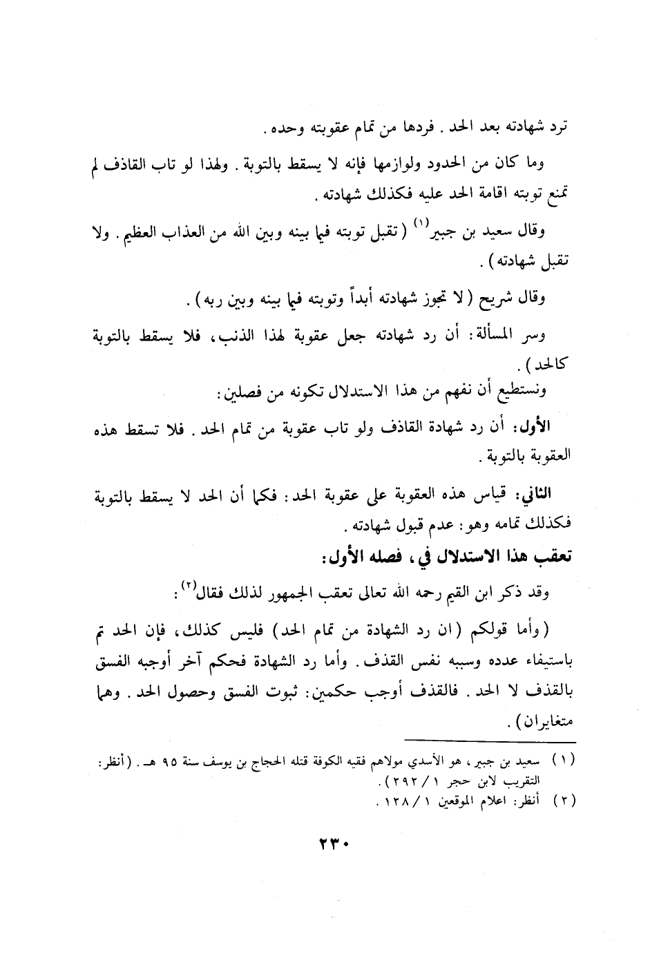 (وأما قولكم (إن رد الشهادة من تمام الحد) فليس كذلك، فإن الحد تم باستيفاء عدد5 وسببه نفس القذف. وأما رد الشهادة فحكم آخر أوجبه الفسق بالقذف لا الحد. فالقذف أوجب حكمين: ثبوت الفسق وحصول الحد. وها متغايران) .
