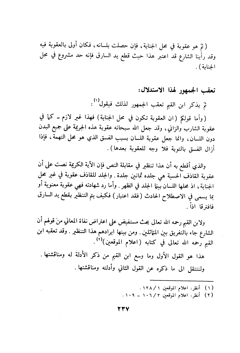 (وأما قولكم (إن العقوبة تكون في محل الجناية) فهذا غير لازم- كما في عقوبة الشارب والزاني، وقد جعل الله سبحانه عقوبة هذه الجريمة على جميع البدن دون اللسان، وإنما جعل عقوبة اللسان بسبب الفسق الذي هو محل التهمة، فإذا أزال الفسق بالتوبة فلا وجه للعقوبة بعدها) .