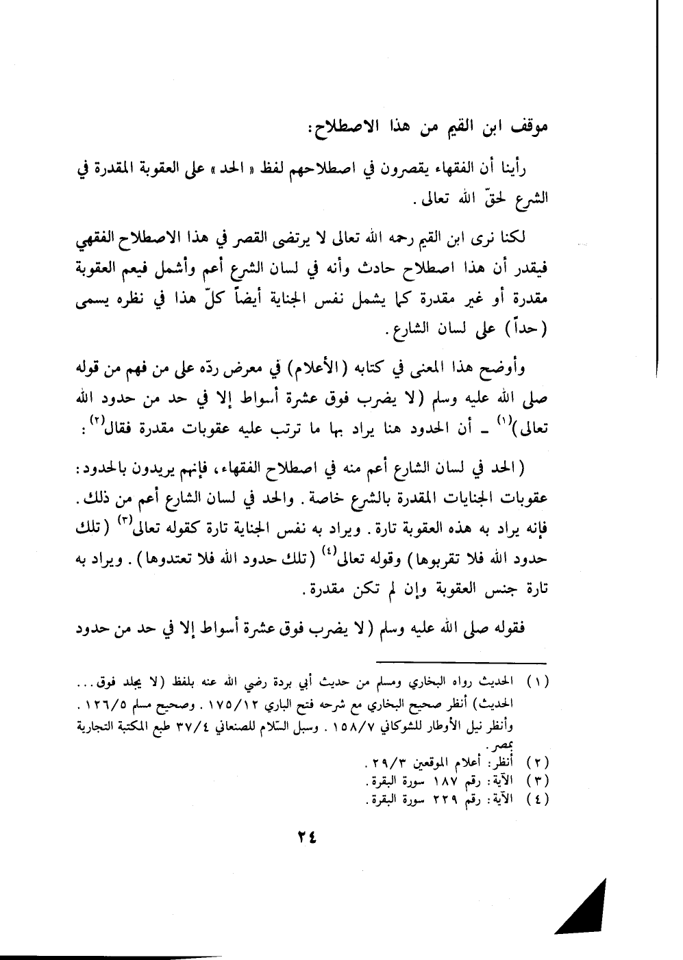 لكنا نرى ابن القيم رحمه الله تعالى لا يرتضى القصر في هذا الاصطلاح الفقهي فيقدر أن هذا اصطلاح حادث وأنه في لسان الشرع أعم وأشمل فيعم العقوبة مقدرة أو غير مقدرة كما يشمل نفس الجناية أيضاً كلّ هذا في نظره يسمى (حداً) على لسان الشارع.