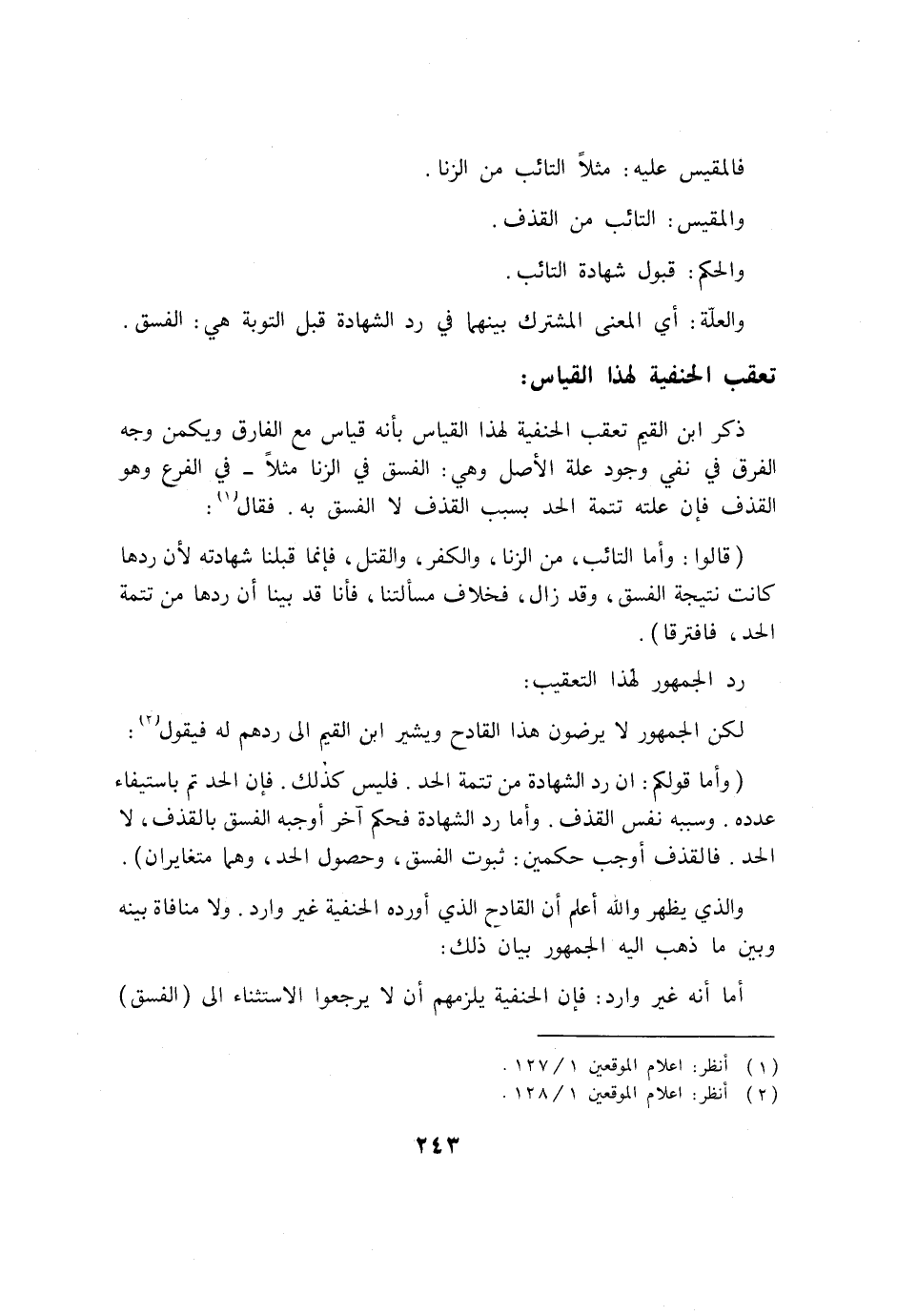 والعلة: أي المعنى المشترك بينهما في رد الشهادة قبل التوبة هي: الفسق. تعقب الحنفية لهذا القياس: