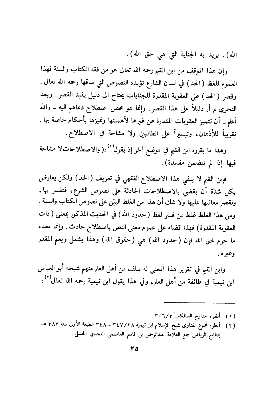فابن القيم لا ينفي هذا الاصطلاح الفقهي في تعريف (الحد) ولكن يعارض بكل شدّة أن يقضي بالاصطلاحات الحادثة على نصوص الشرع، فتفسر بها، وتقصر معانيها عليها ولاشك أن هذا من الغلط البيّن على نصوص الكتاب والسنة. ومن هذا الغلط غلط من فسر لفظ (حدود الله) في الحديث المذكور بمعنى (ذات العقوبة المقدرة) فهذا قضاء على عموم معنى النص باصطلاح حادث. وإنما معناه ما حرم لحق الله فإن (حدود الله) هي (حقوق الله) وهذا يشمل ويعم المقدر وغيره.