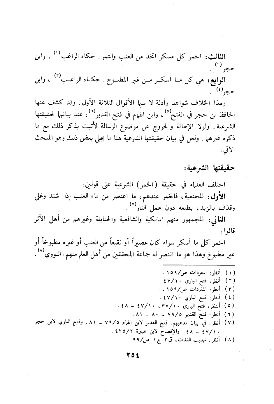 الخمر كل ما أسكر سواء كان عصيراً أو نقيعاً من العنب أو غيره مطبوخاً أو غير مطبوخ وهذا هو ما انتصر له جماعة المحققين من أهل العلم منهم: النووي (8) ،