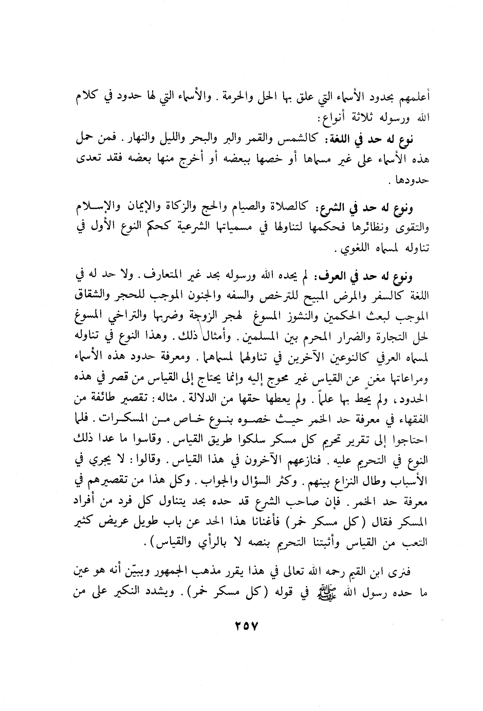 الحدود، ولم يحط بها علماً. ولم يعطها حقها من الدلالة. مثاله: تقصير طائفة من الفقهاء في معرفة حد الخمر حيث خصوه بنوع خاص من المسكرات. فلما احتاجوا إلى تقرير تحريم كل مسكر سلكوا طريق القياس. وقاسوا ما عدا ذلك النوع في التحريم عليه. فنازعهم الآخرون في هذا القياس. وقالوا: لا يجري في الأسباب وطال النزاع بينهم. وكثر السؤال والجواب. وكل هذا من تقصيرهم في معرفة حد الخمر. فإن صاحب الشرع قد حده بحد يتناول كل فرد من أفراد السكر فقال (كل مسكر خمر) فأغنانا هذا الحد عن باب طويل عريض كثير التعب من القياس وأثبتنا التحريم بنصه لا بالرأي والقياس) .