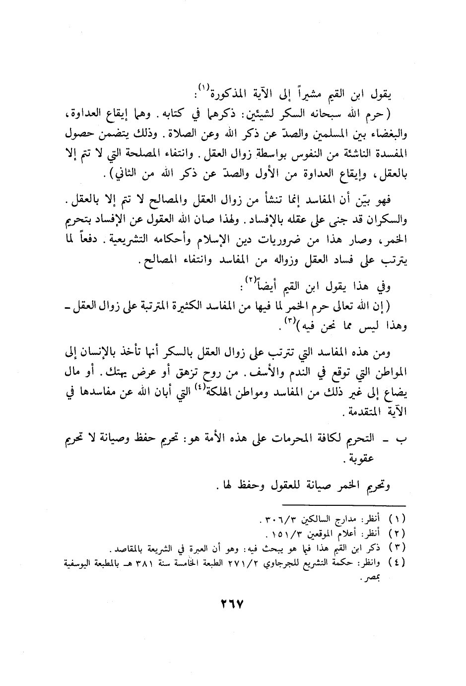 فهو بيّن أن المفاسد إنما تنشأ من زوال العقل والمصالح لا تتم إلا بالعقل. والسكران قد جنى على عقله بالإفساد. ولهذا صان الله العقول عن الإفساد بتحريم الخمر، وصار هذا من ضروريات دين الإسلام وأحكامه التشريعية. دفعاً لما يترتب على فساد العقل وزواله في المفاسد وانتفاء المصالح.