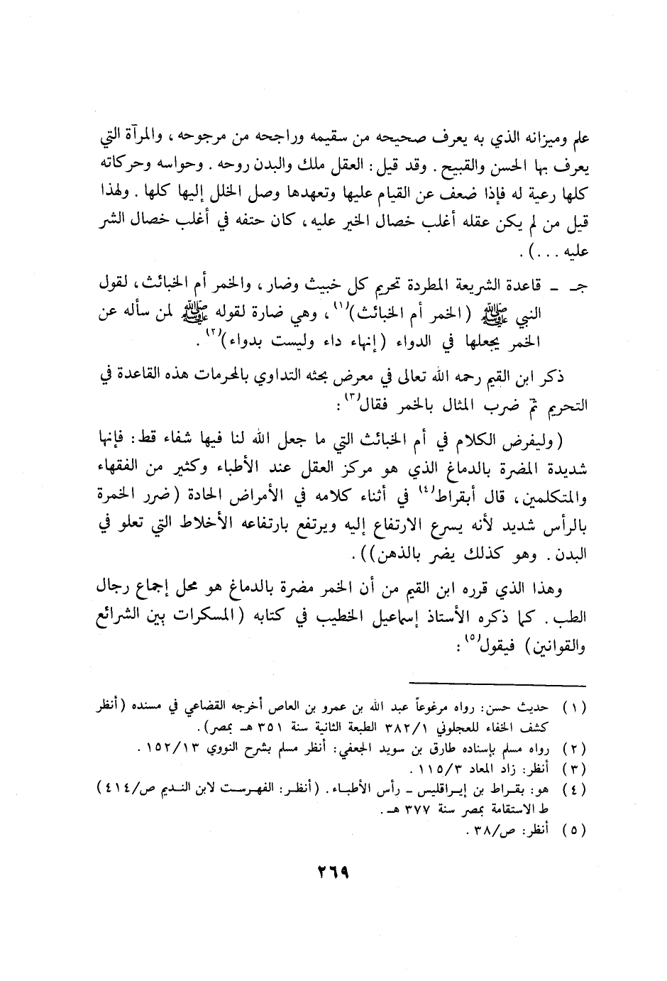 وهذا الذي قرره ابن القيم من أن الخمر مضرة بالدماغ هو محل إجماع رجال الطب. كما ذكره الأستاذ إسماعيل الخطيب في كتابه (المسكرات بين الشرائع والقوانين) فيقول (5) :