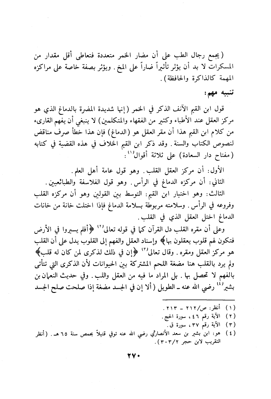 قول ابن القيم الآنف الذكر في الخمر (إنها شديدة المضرة بالدماغ الذي هو مركز العقل عند الأطباء وكثير من الفقهاء والمتكلمين) لا ينبغي أن يفهم القارئ من كلام ابن القيم هذا أن مقر العقل هو (الدماغ) فإن هذا خطأ صرف مناقض لنصوص الكتاب والسنة. وقد ذكر ابن القيم الخلاف في هذه القضية في كتابه (مفتاح دار السعادة) على ثلاثة أقوال (1) :