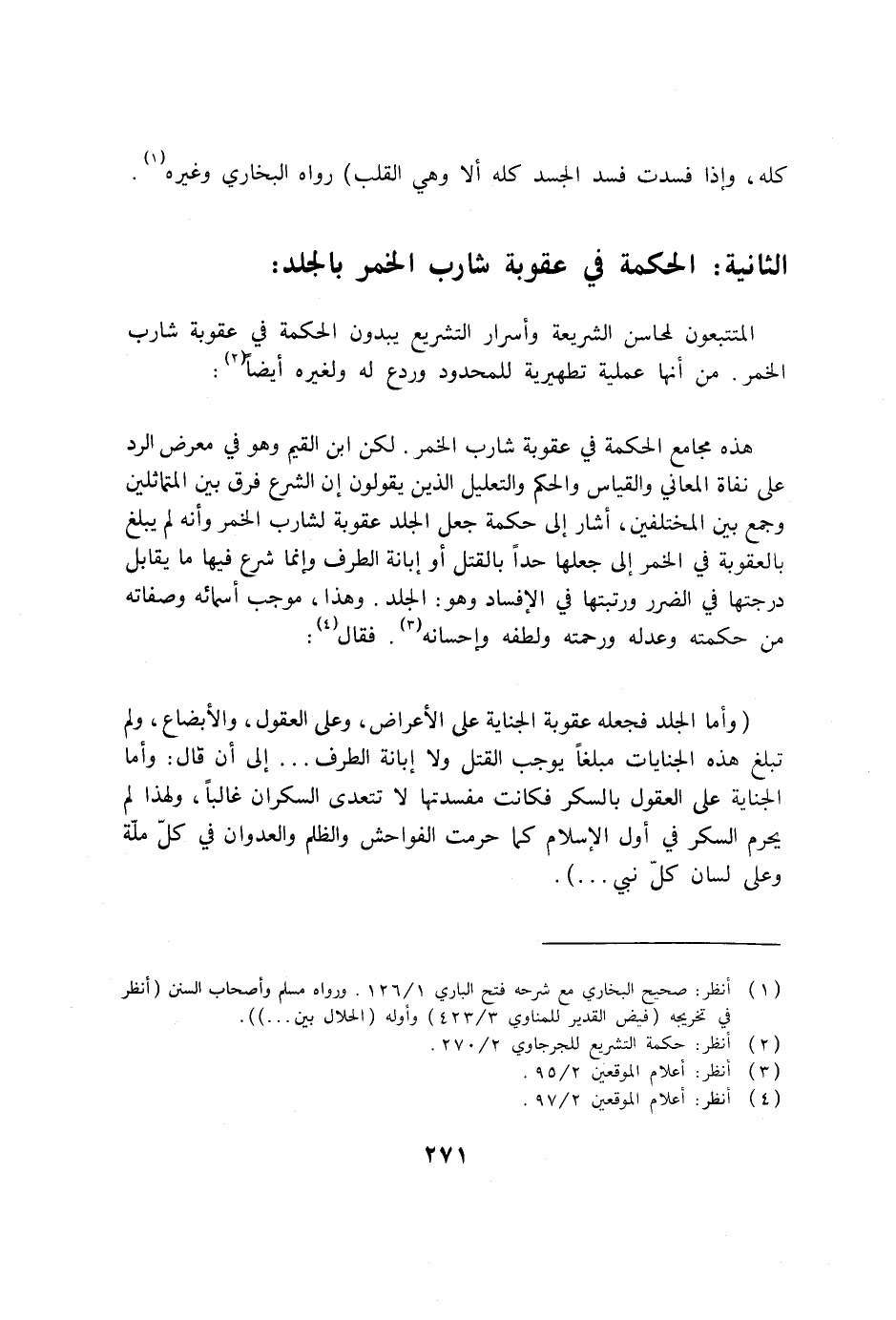 هذه مجامع الحكمة في عقوبة شارب الخمر. لكن ابن القيم وهو في معرض الرد على نفاة المعاني والقياس والحكم والتعليل الذين يقولون إن الشرع فرق بين المتماثلين وجمع بين المختلفين، أشار إلى حكمة جعل الجلد عقوبة لشارب الخمر وأنه لم يبلغ بالعقوبة في الخمر إلى جعلها حداً بالقتل أو إبانة الطرف وإنما شرع فيها ما يقابل درجتها في الضرر ورتبتها في الإفساد وهو: الجلد. وهذا، موجب أسمائه وصفاته من حكمته وعدله ورحمته ولطفه وإحسانه (3) . فقال (4) :