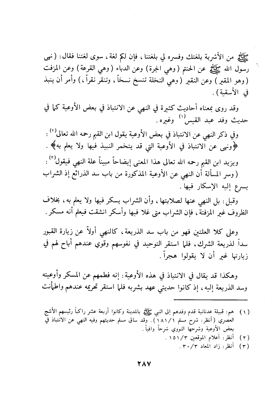 ويزيد ابن القيم رحمه الله تعالى هذا المعنى إيضاحاً مبيناً علة النهي فيقول (3) : (وسر المسألة أن النهي عن الأوعية المذكورة من باب سد الذرائع إذ الشراب يسرع إليه الإسكار فيها.