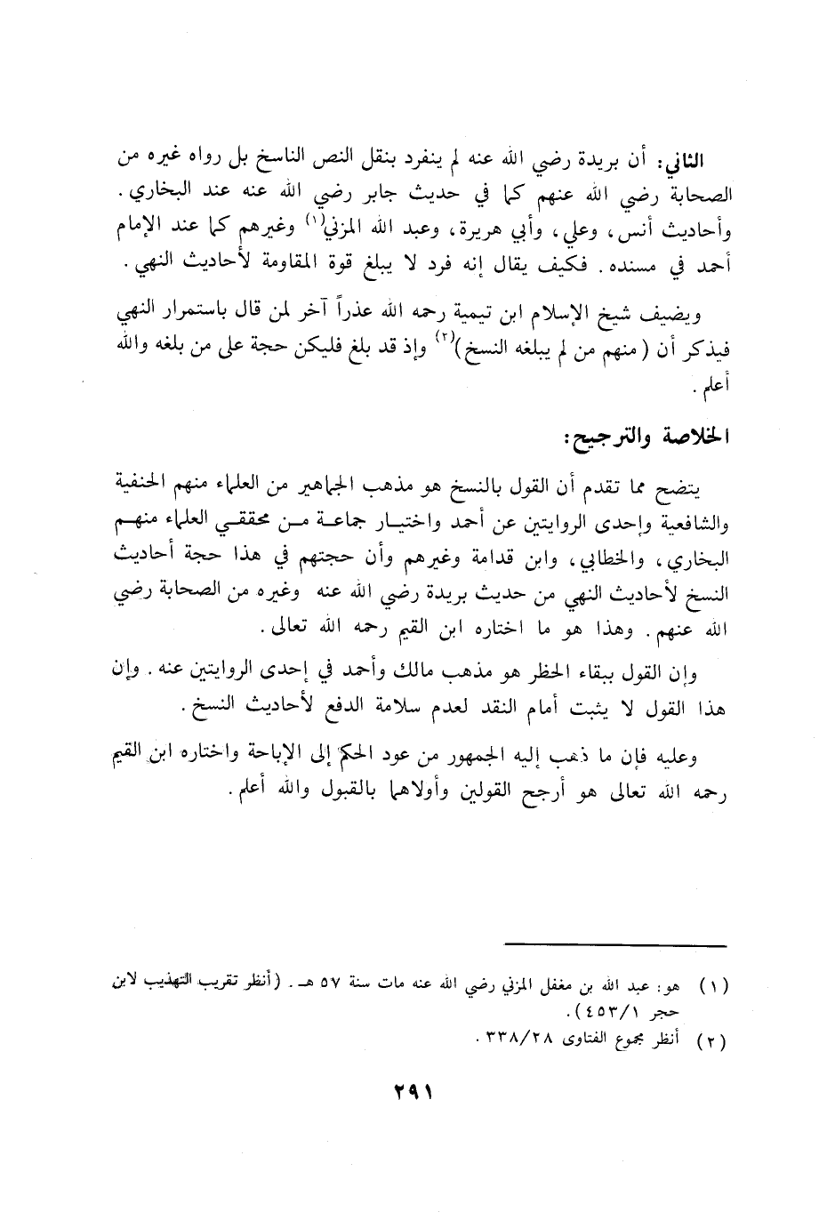 الثاني: أن بريدة رضي الله عنه لم ينفرد بنقل النص الناسخ بل رواه غيره من الصحابة رضي الله عنهم كما في حديث جابر رضي الله عنه عند البخاري. وأحاديث أنس، وعلي، وأبي هريرة، وعبد الله المزني (1) وغيرهم كما عند الإمام أحمد في مسنده. فكيف يقال إنه فرد لا يبلغ قوة المقاومة لأحاديث النهي. ويضيف شيخ الإسلام ابن تيمية رحمه الله عذراً آخر لن قال باستمرار النهي فيذكر أن (منهم من لم يبلغه النسخ) (2) وإذ قد بلغ فليكن حجة على من بلغه والله أعلم.