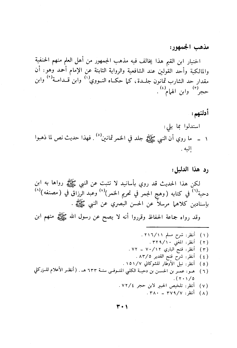 اختيار ابن القيم هذا يخالف فيه مذهب الجمهور من أهل العلم منهم الحنفية والمالكية وأحد القولين عند الشافعية والرواية الثابتة عن الإمام أحمد وهو: أن مقدار حد الشارب ثمانون جلدة، كما حكاه النووي (1) وابن قدامة (2) وابن