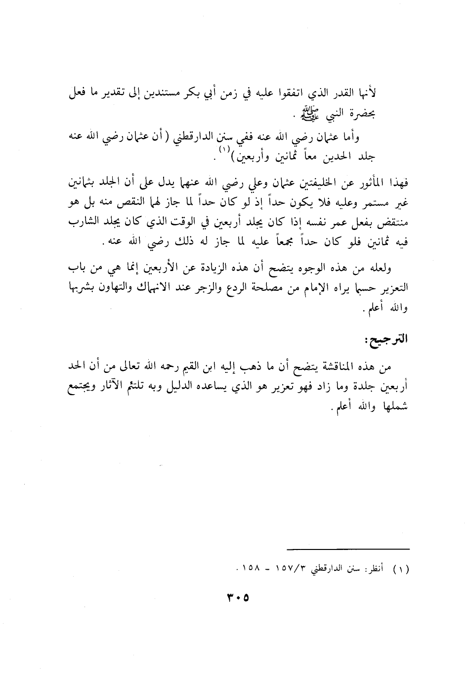 من هذه المناقشة يتضح أن ما ذهب إليه ابن القيم رحمه الله تعالى من أن الحد أربعين جلدة وما زاد فهو تعزير هو الذي يساعده الدليل وبه تلتئم الآثار ويجتمع شملها والله أعلم.