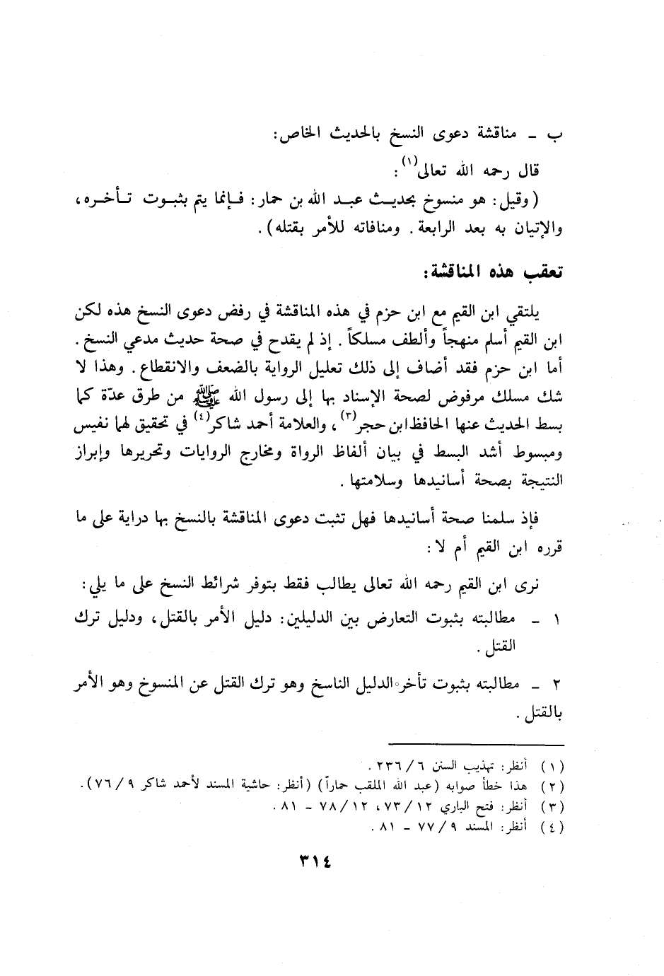 نرى ابن القيم رحمه الله تعالى يطالب فقط بتوفر شرائط النسخ على ما يلي: 1- مطالبته بثبوت التعارض بين الدليلين: دليل الأمر بالقتل، ودليل ترك القتل.