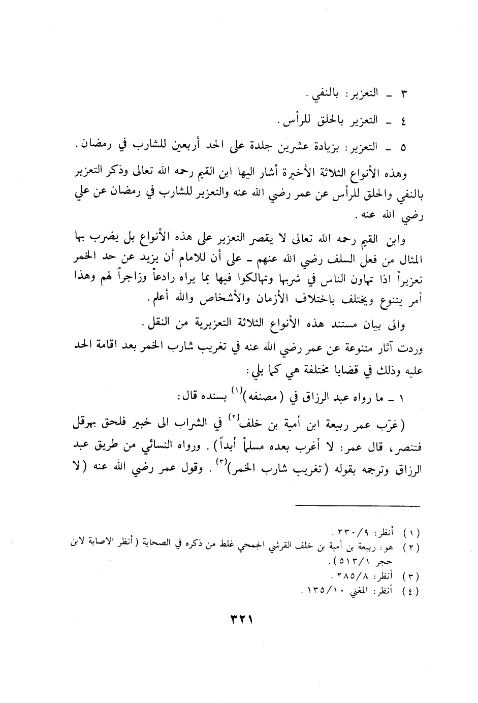 (غرّب عمر ربيعة ابن أمية بن خلف (2) في الشراب إلى خبير فلحق بهرقل فتنصر، قال عمر: لا أغرب بعده مسلماً أبداً) . ورواه النسائي من طريق عبد الرزاق وترجمه بقوله (تغريب شارب الخمر) (3) . وقول عمر رضي الله عنه (لا