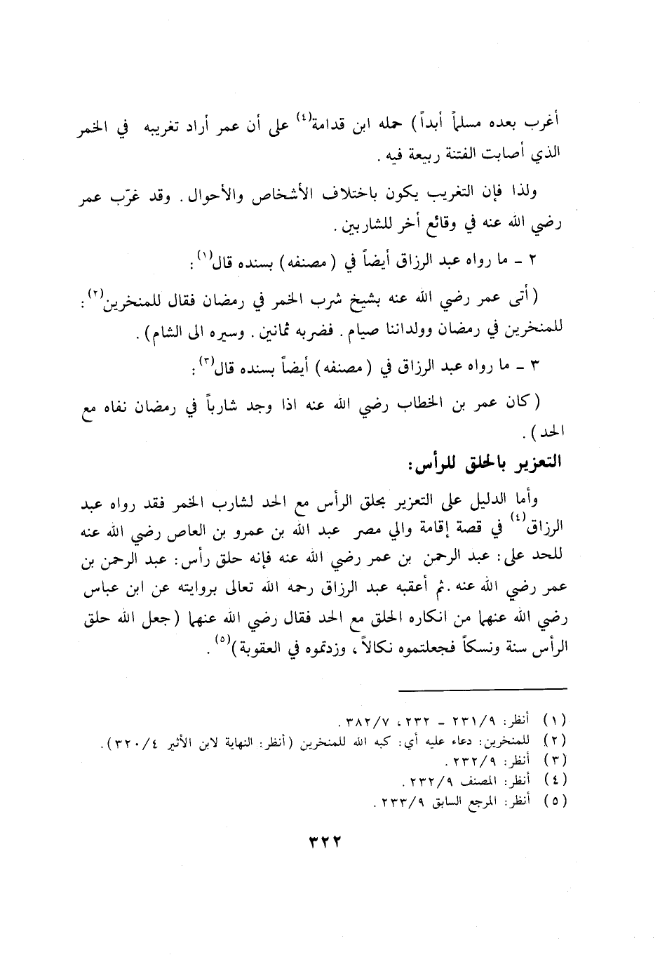 للحد على: عبد الرحمن بن عمر رضي الله عنه فإنه حلق رأس: عبد الرحمن بن عمر رضى الله عنه. ثم أعقبه عبد الرزاق رحمه الله تعالى بروايته عن ابن عباس رضي الله عنهما من إنكاره الحلق مع الحد فقال رضي الله عنهما (جعل الله حلق الرأس سنة ونسكاً فجعلتموه نكالاً، وزدتموه في العقوبة) (5) .