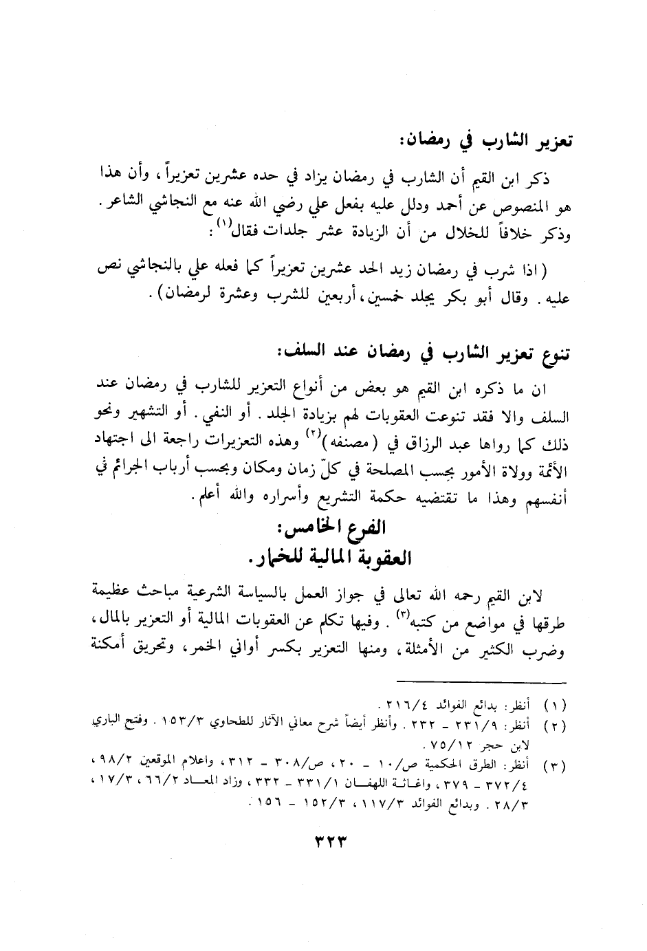 إن ما ذكره ابن القيم هو بعض من أنواع التعزير للشارب في رمضان عند السلف وإلا فقد تنوعت العقوبات لهم بزيادة الجلد. أو النفي. أو التشهير ونحو ذلك كما رواها عبد الرزاق في (مصنفه) (2) وهذه التعزيرات راجعة إلى اجتهاد الأئمة وولاة الأمور بحسب المصلحة في كلّ زمان ومكان وبحسب أرباب الجرائم في أنفسهم وهذا ما تقتضيه حكمة التشريع وأسراره والله أعلم.